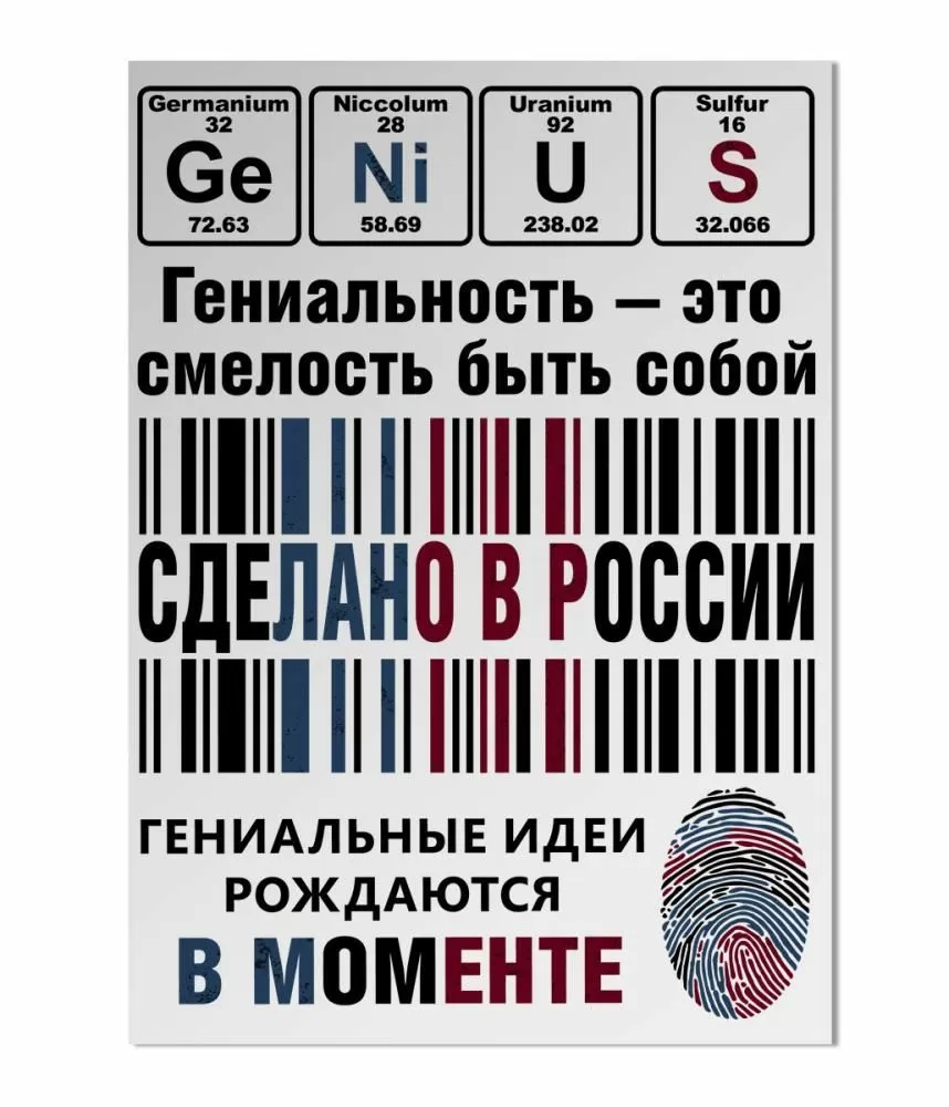 Подарочная открытка формата Евро «Гениальность – это смелость быть собой. Сделано в России» предназначена для оформления денежных подарков, сертификатов и памятных поздравлений молодоженам и их окружению. Изделие выполнено из плотного картона, устойчивого к изгибам и истиранию, что важно при транспортировке и длительном хранении на складе и в розничной выкладке. Лицевые элементы дизайна выполнены в стиле периодической таблицы и штрих‑кода с акцентной надписью «Сделано в России» и слоганом «Гениальные идеи рождаются в моменте», что позволяет использовать открытку как универсальный сувенир для свадьбы, помолвки, венчания, бумажной или золотой свадьбы, а также как дополнение к сберегательной книжке, денежному подарку или подарочному сертификату. Радужные блестки в лаке наносятся локально, образуя аккуратный декоративный слой без осыпания, благодаря чему открытка подходит для розничной продажи в упаковке с конвертом и для оптовых поставок в смешанных партиях дизайнерских и памятных изделий. Поверхность картона пригодна для нанесения индивидуальных надписей, пожеланий и напутствий в счастливую семейную жизнь, а также для вклейки фото жениха и невесты или небольших плоских сувениров. Формат Евро удобен для вложения денежных купюр, сертификатов и фотографий стандартных размеров, совместим с типовыми почтовыми конвертами и файловыми системами, что снижает издержки при комплектации ассортимента. Открытка может использоваться как самостоятельный подарочный элемент или как часть набора: с конвертом для денег, с фото, с памятной надписью от родителей, друзей, коллег, подруги, что расширяет варианты применения в оптовых закупках для свадебных агентств, магазинов подарков и канцелярии. Плотный картон и устойчивое покрытие позволяют сохранять внешний вид изделия при частом перелистывании и экспонировании, что делает открытку подходящей для витрин, стендов и длительного хранения как памятного сувенира. Количество в упаковке: 10.
