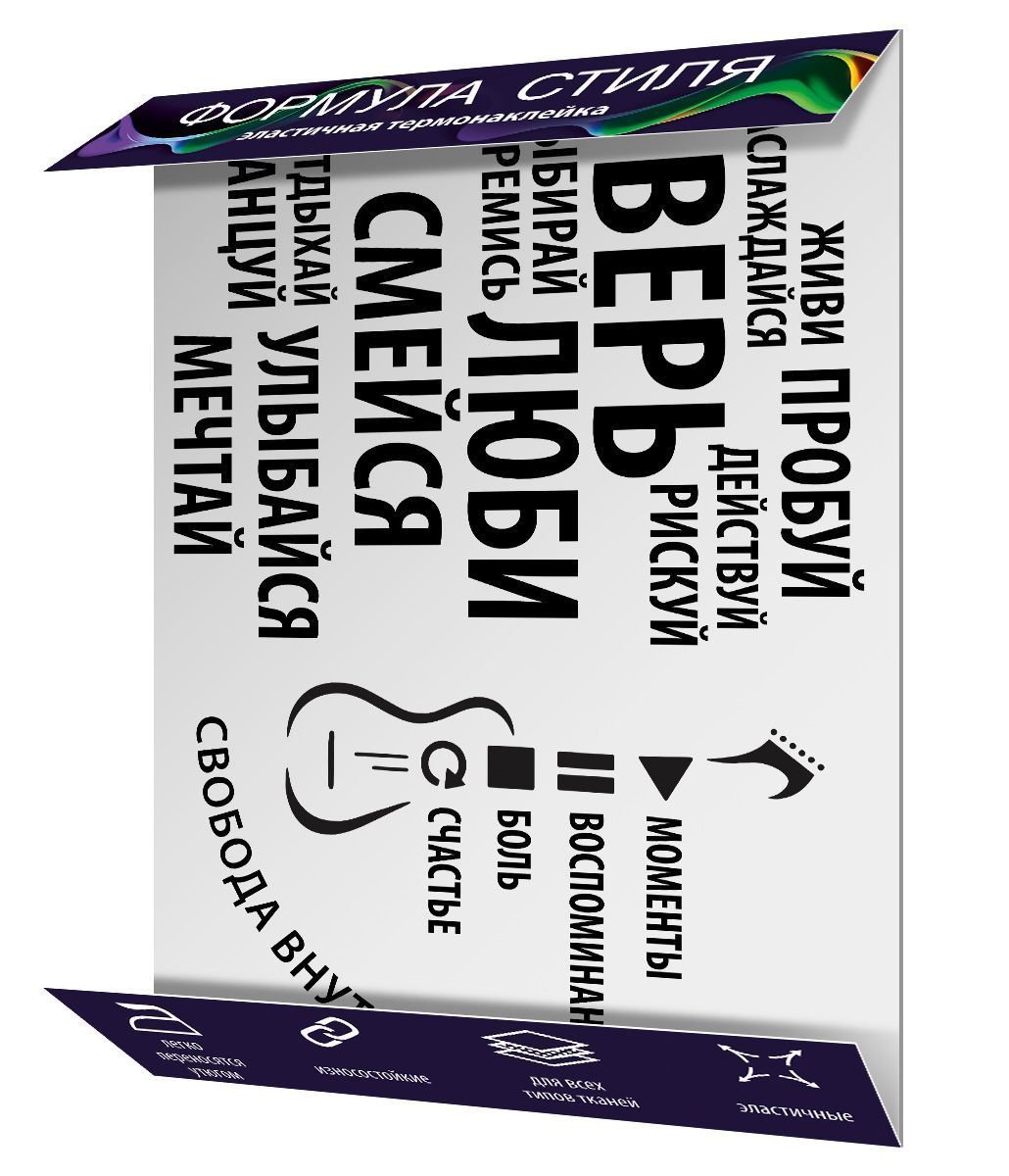 Термонаклейка формата евро из ПВХ предназначена для декорирования текстильных изделий и может использоваться как в мелкооптовых, так и в крупных тиражах. Лист размером 208×148 мм содержит композицию из отдельных элементов, выполненных в виде стилизованной гитары и набора мотивационных надписей разной ориентации и кегля. Все элементы сгруппированы на подложке, что упрощает хранение, учет и раскрой при поточном применении. ПВХ-основа обеспечивает стабильную геометрию деталей, четкий контур и равномерное прилегание к ткани после термопереноса. Материал устойчив к растяжению, не растрескивается при умеренных изгибах и выдерживает многократные стирки при соблюдении рекомендованных температурных режимов, что важно для серийного производства сувенирного и повседневного текстиля. Наклейка подходит для хлопка, смесовых и синтетических тканей с гладкой поверхностью, что делает изделие универсальным для использования на футболках, толстовках, сумках, чехлах, интерьерном текстиле и промо-продукции. Отсутствие дополнительной отделки облегчает комбинирование с другими видами печати и нашивок в рамках единой коллекции. Для оптового заказчика данная термонаклейка удобна в планировании ассортимента: стандартный формат листа упрощает выкладку, упаковку и транспортировку, а единичное количество в упаковке позволяет точно рассчитывать тиражи и комплектацию партий. Розничный покупатель получает готовое решение для индивидуального оформления одежды и аксессуаров: отдельные элементы можно вырезать и располагать на изделии в произвольной композиции, регулируя насыщенность дизайна и адаптируя его под конкретный размер и фасон изделия.