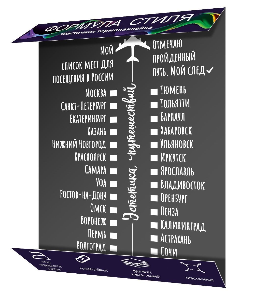 Термонаклейка формата евро из ПВХ предназначена для декоративного и информационного оформления поверхностей с применением термопереноса. Готовое изделие размером 208×148 мм выполнено на подложке, что упрощает хранение, транспортировку и серийное нанесение в условиях розничных точек, мастерских и сувенирных производств. Изображение представляет собой тематический список городов России с чек-боксами и графикой самолёта, формирующий визуализированный маршрут путешествий; композиция выстроена так, чтобы после переноса оставались только элементы изображения, без фона. Отсутствие дополнительной отделки делает изделие технологичным для массовых тиражей: поверхность равномерная, без рельефа и лакировки, что снижает риск повреждений при штабелировании и обеспечивает стабильное качество при многократных циклах нагрева. ПВХ-основа отличается износостойкостью, устойчивостью к истиранию и сохранением формы, что важно при эксплуатации на текстиле и других гибких основаниях. Наклейка может применяться на хлопковых и смешанных тканях, чехлах, дорожных аксессуарах, сувенирной продукции туристической тематики, а также на плотной бумаге и картоне, если допускается нагрев, что позволяет включать её в комплексные линейки подарков и сопутствующих товаров для путешественников. Для розничного пользователя изделие служит наглядным чек-листом посещённых городов и элементом персонализации одежды или интерьера, при этом компактный формат удобен для размещения на футболках, шопперах, дорожных органайзерах и обложках. Поставляется в количестве 1, что облегчает формирование как единичных, так и комбинированных оптовых наборов по тематикам путешествий и географии, с возможностью точного планирования складских остатков и выкладки по артикулам.