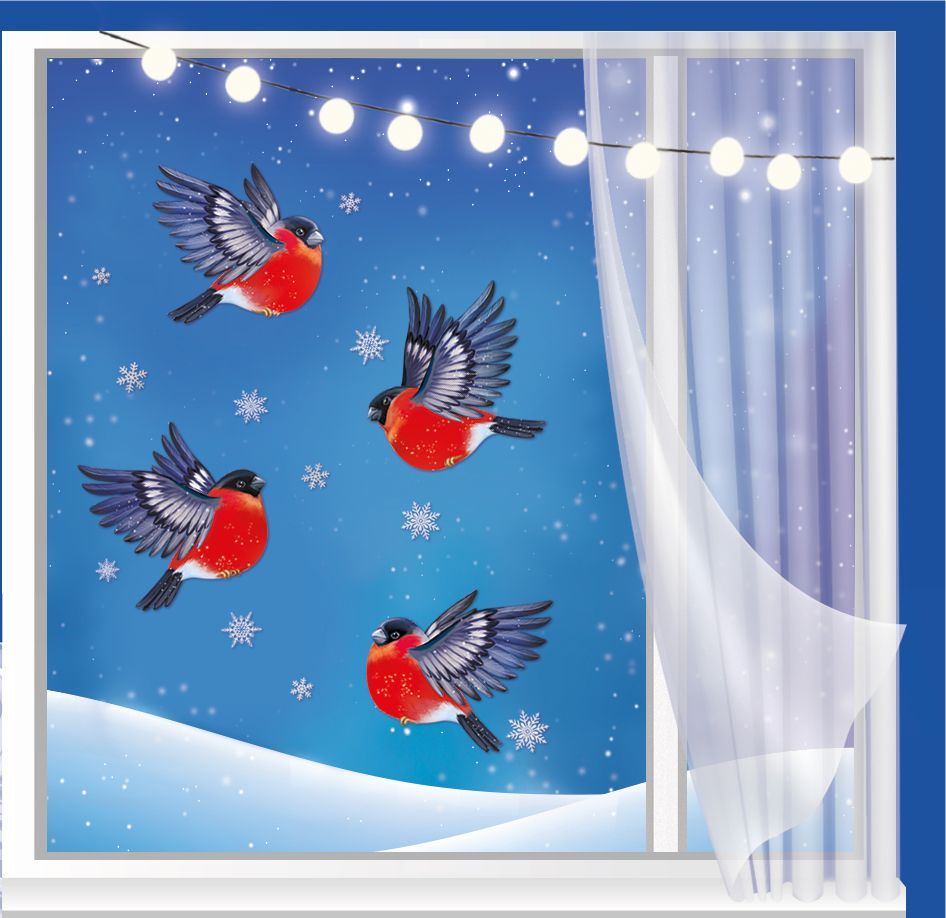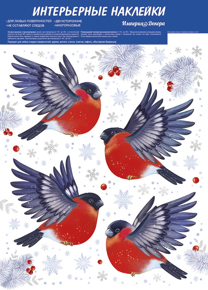 Наклейка оформительская формата А4 выполнена из самоклеящейся пленки с полноцветной печатью зимнего сюжета: на листе размещены крупные изображения снегирей на фоне снежинок, еловых ветвей и красных ягод. Материал обеспечивает надежное прилегание к гладким поверхностям и устойчивость к истиранию, что важно при интенсивной сезонной эксплуатации в торговых залах, витринах, офисных пространствах и местах с повышенным потоком посетителей. Лицевая сторона дополнительно обработана глянцевым УФ-лаком с использованием белил, за счет чего изображение имеет повышенную яркость, четкий контур и дополнительную защиту от влаги и выгорания при стандартном внутреннем освещении. Размер готового изделия 332 × 237 мм позволяет использовать наклейку как самостоятельный элемент декора или комбинировать с другими листами в серии для оформления больших площадей. Отсутствие текста делает изделие универсальным для розничной торговли, HoReCa, детских учреждений, офисов и домашнего интерьера, в том числе для новогоднего и зимнего оформления окон, дверей, мебели, витрин и других гладких оснований. Плотность и структура пленки подобраны таким образом, чтобы лист сохранял форму при хранении и перевозке, не коробился и не рвался при отделении элементов от подложки, что снижает процент брака при массовых выкладках. Наклейка поставляется в упаковке по 10 штук, что удобно для планирования оптовых закупок, формирования ассортиментных линеек и равномерного распределения по торговым точкам. Конструкция изделия рассчитана на использование внутри помещений, совместима с большинством непористых поверхностей, допускает аккуратное удаление без заметных следов клея при соблюдении рекомендаций производителя по подготовке основы и температурному режиму.
