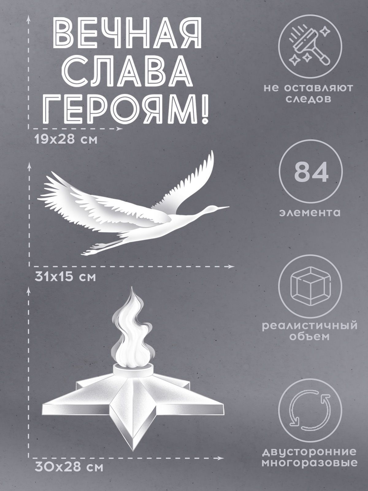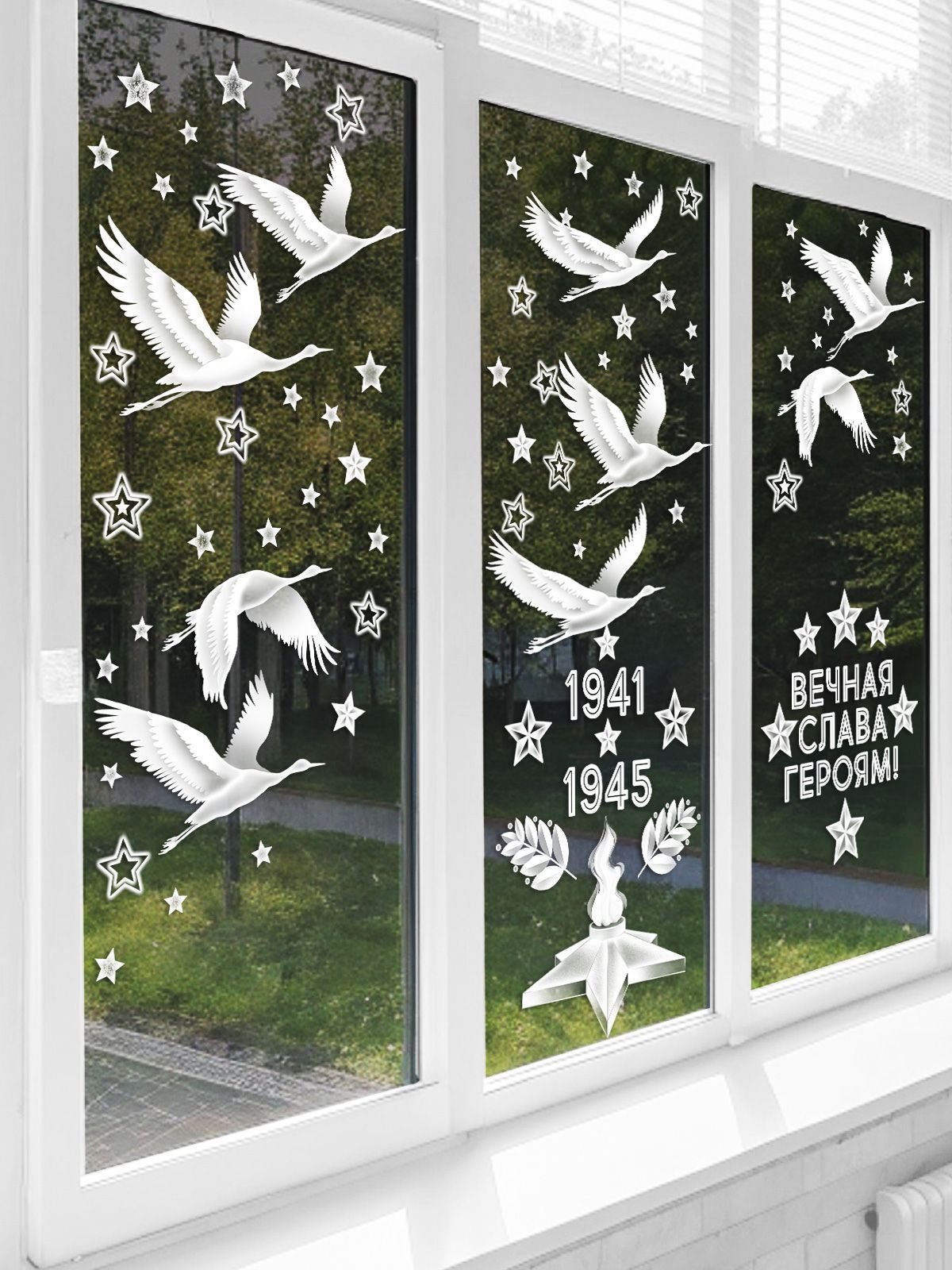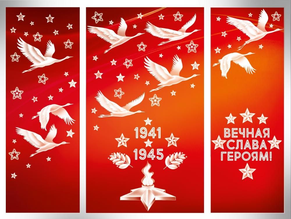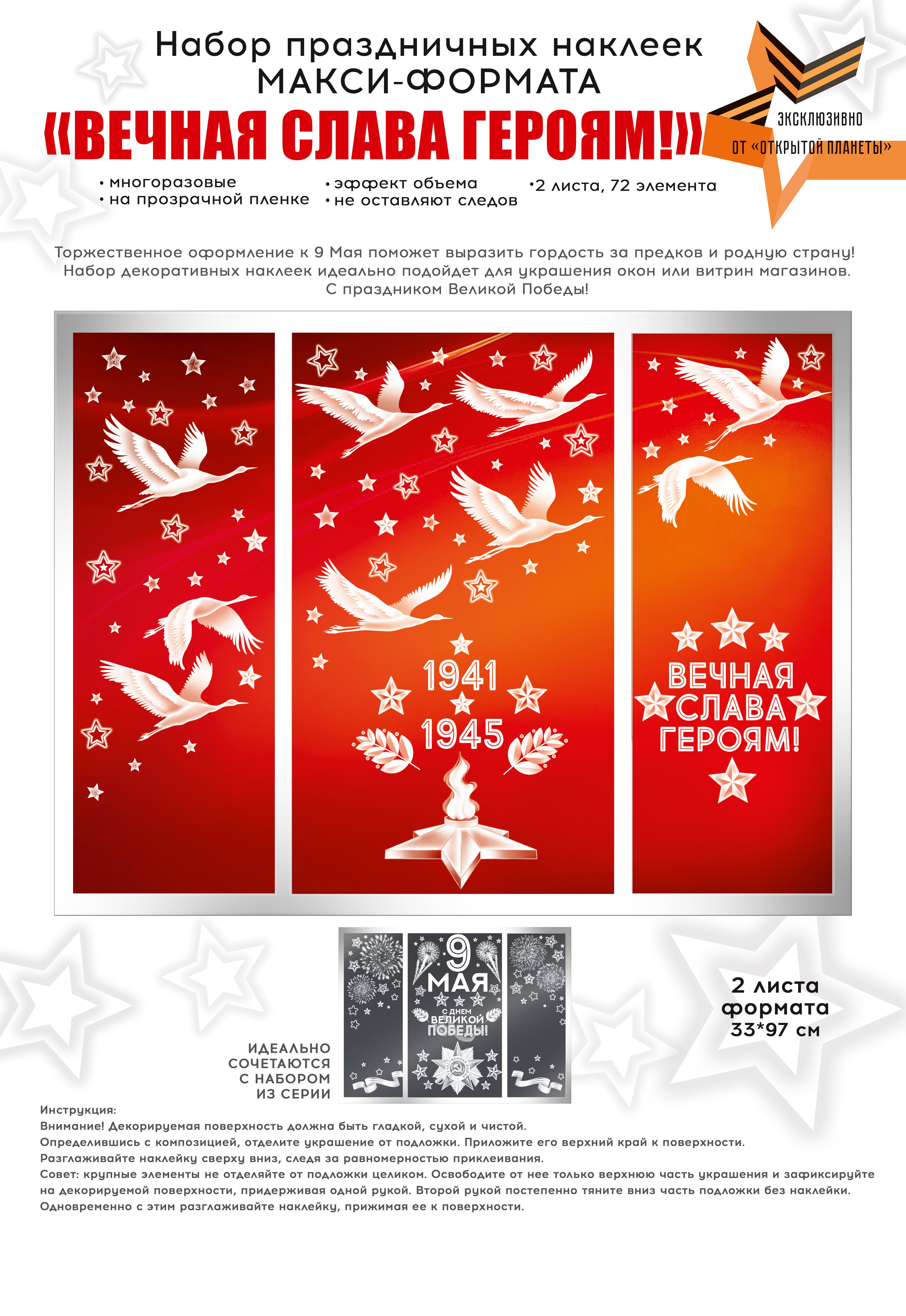 Наклейка оформительская формата А1 изготовлена из самоклеящейся плёнки и предназначена для оформления интерьеров и витрин к памятным датам военной тематики. Изделие имеет фигурную вырубку: отдельные элементы композиции (журавли, звёзды, декоративные детали) вырезаны по контуру, что позволяет гибко компоновать изображение на поверхности и адаптировать его под разные размеры витрин, стен, дверных и оконных проёмов. Двустороннее изображение обеспечивает одинаковую читаемость и насыщенность цветов при обзоре с улицы и изнутри помещения, что особенно важно при использовании на стеклянных перегородках и витринном остеклении. Размер готового изделия 970×664 мм обеспечивает хорошую видимость композиции в крупных помещениях и на дистанции, при этом формат удобен для транспортировки и складского хранения в рулонах или плоских пачках. Материал — плотная самоклеящаяся плёнка с отделкой белилами и фотографическим качеством печати, что повышает контраст белых элементов на красно-оранжевом градиентном фоне и делает контуры чёткими при искусственном и дневном освещении. Плёнка рассчитана на наклеивание на гладкие, чистые и сухие поверхности: стекло, окрашенные панели, пластик, ламинированные основы; при аккуратном снятии риск повреждения основания минимален, что удобно для сезонного оформления. Изображение включает тематические элементы военного мемориала, даты 1941–1945 и надпись «ВЕЧНАЯ СЛАВА ГЕРОЯМ!», что позволяет использовать наклейку в образовательных учреждениях, учреждениях культуры, офисах и торговых залах для создания единообразного визуального ряда к памятным мероприятиям. Для розничного покупателя изделие подходит для декорирования окон и стен в доме, подъезде или на входной группе, обеспечивая быстрый монтаж без дополнительных инструментов. В упаковке 1.