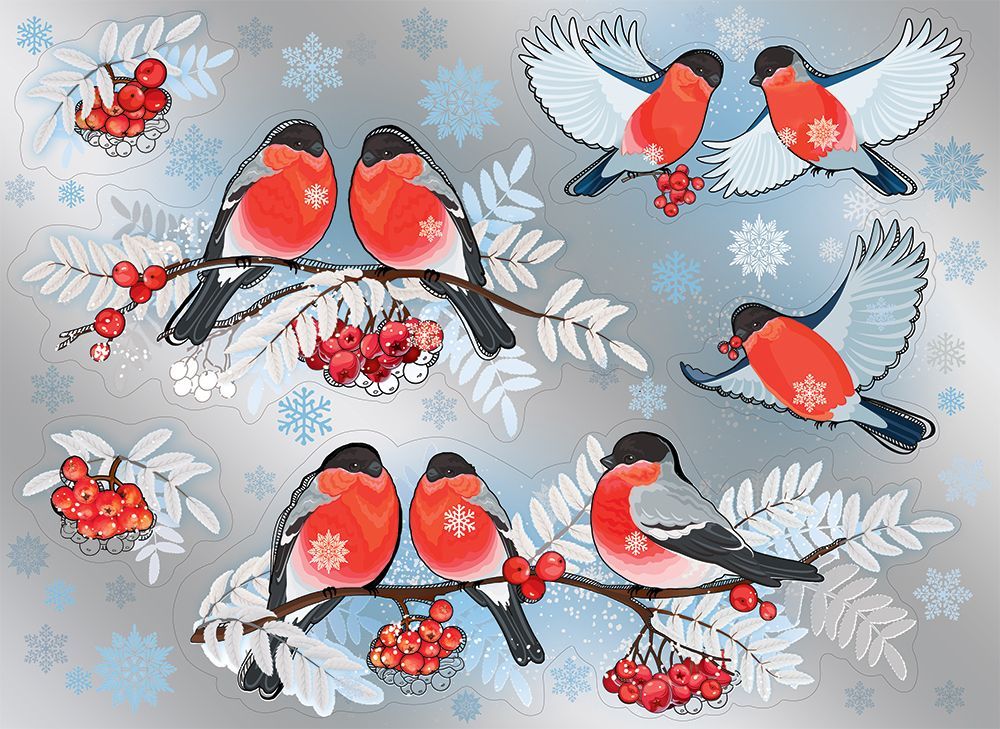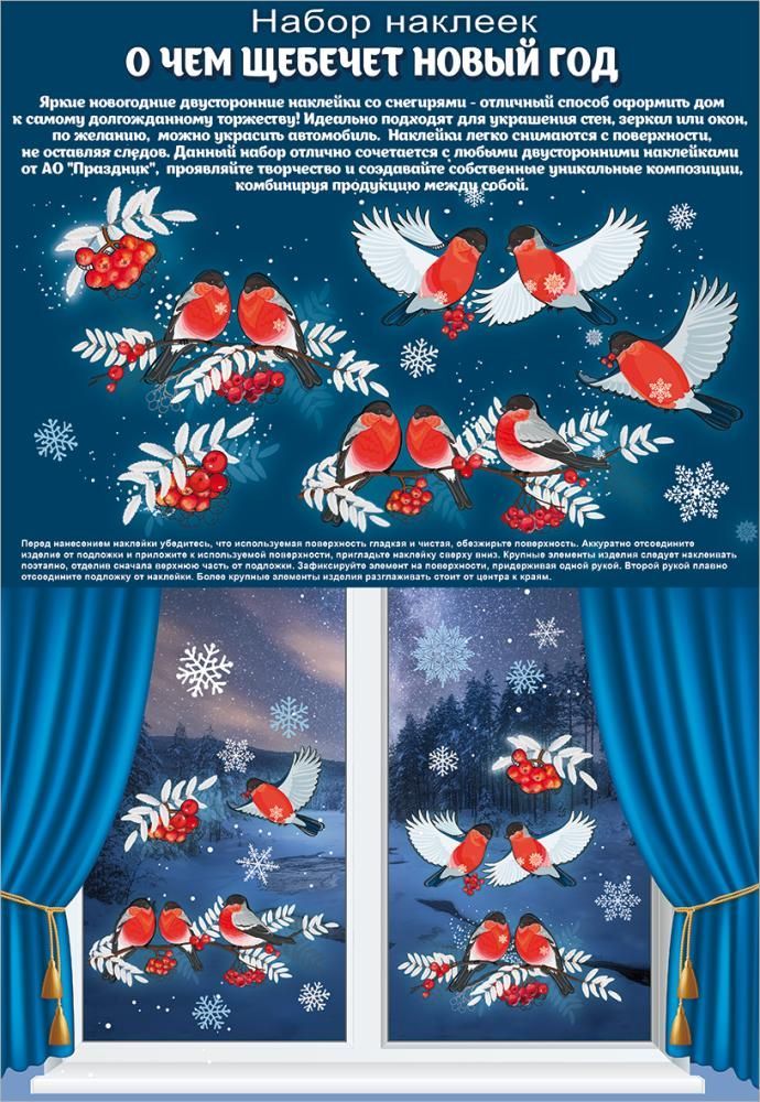 Наклейка оформительская формата А1 изготовлена из самоклеящейся пленки с двусторонним изображением зимнего сюжета: снегири, грозди рябины, снежинки и декоративные ветви на насыщенном синем фоне. Фигурная вырубка обеспечивает точный контур каждого элемента, что удобно при создании композиции на стеклянных и гладких поверхностях. Размер готового изделия 672 × 489 мм позволяет использовать наклейку как самостоятельный акцент в витринном или интерьерном оформлении, а также комбинировать с другими элементами ассортимента. Материал рассчитан на краткосрочное и среднесрочное сезонное применение в помещениях, устойчив к типичным эксплуатационным нагрузкам при аккуратном наклеивании и снятии, не требует дополнительного клея и не деформируется при нормальных колебаниях температуры и влажности. Глянцевый УФ-лак и белила в отделке повышают яркость цвета, создают выраженный декоративный эффект при искусственном и дневном освещении и дополнительно защищают печать от истирания и выцветания. Наличие двустороннего изображения делает изделие функциональным для оконных витражей и входных групп, где картинка должна быть одинаково читаемой как изнутри, так и снаружи. Отсутствие текста на изображении позволяет использовать наклейку в нейтральном новогоднем и зимнем оформлении без привязки к конкретным надписям и языку, что удобно для сетевого и регионального ритейла, общественных пространств, офисов и объектов HoReCa. В упаковке 1. Изделие поставляется в плоском виде, что облегчает хранение и транспортировку оптовых партий, снижает риск заломов и упрощает выкладку в торговом зале. Для розничного использования наклейка подходит для декорирования окон, витрин, зеркал, межкомнатных стеклянных перегородок и гладких дверных полотен, обеспечивая быстрый сезонный декор без дополнительных инструментов и сложного монтажа.