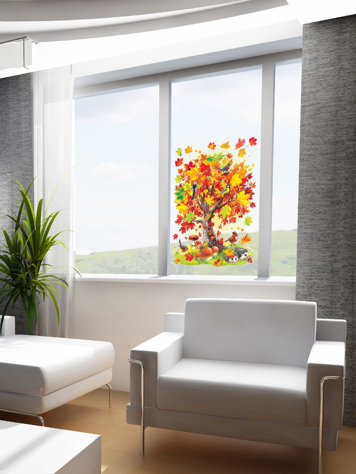 Наклейка оформительская формата А3 изготовлена из самоклеящейся плёнки и предназначена для оформления интерьеров, витрин, учебных и детских помещений, сезонного декора и тематических экспозиций. Изображение представляет собой осеннее дерево с яркими жёлтыми, оранжевыми и красными листьями, птицами, грибами и лесными животными, а также отдельные элементы в виде разлетающихся листьев, что позволяет формировать как цельную композицию, так и модульное оформление по периметру окна, стены, двери или стенда. Размер готового изделия 470 × 332 мм обеспечивает хорошую читаемость изображения с расстояния и удобен для комбинирования с другими декоративными материалами в витринных и учебных экспозициях. Плёнка имеет глянцевое покрытие с УФ-лаком и белилами, за счёт чего достигается высокая яркость красок, устойчивость к выцветанию при искусственном и естественном освещении и дополнительная защита от влаги и механического истирания при регулярной эксплуатации. Двустороннее изображение позволяет размещать наклейку на стеклянных поверхностях с сохранением полноты рисунка как с внутренней, так и с внешней стороны, что удобно для оформления оконных витрин, входных групп и перегородок. Материал обладает достаточной плотностью для ровного прилегания без провисаний и деформаций, клейкий слой рассчитан на надёжную фиксацию на гладких непористых основаниях при стандартных условиях эксплуатации в помещениях. Наклейка поставляется в количестве 1, что упрощает учёт и дозированную выкладку при оптовых закупках, удобно для формирования ассортимента сезонного декора и комплектования тематических наборов. Для розничного пользователя изделие не требует дополнительных инструментов для монтажа, легко транспортируется и хранится в плоском виде, подходит для краткосрочного и среднесрочного оформления к осенним мероприятиям, занятиям и праздникам.