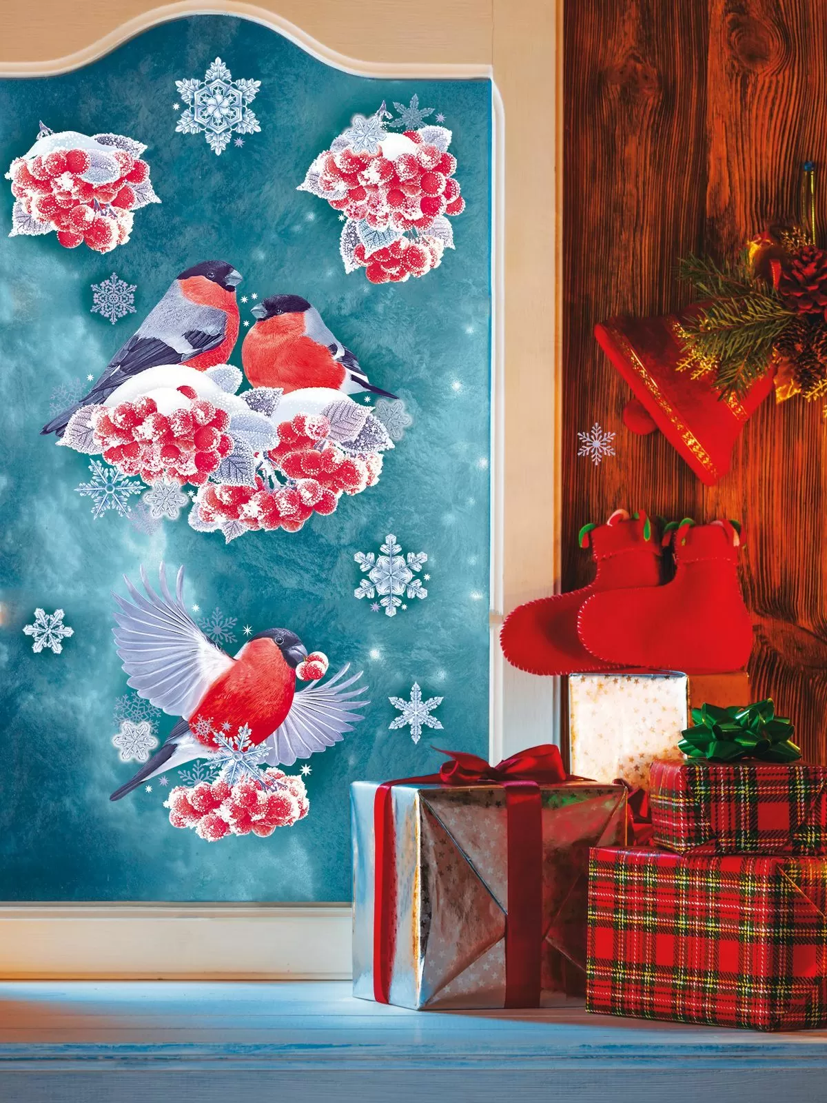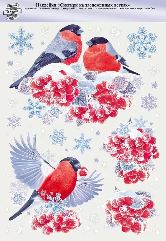 Сверкающие наклейки для праздничного декора! Белоснежный рисунок этих наклеек словно создан из искрящихся снежинок. Блестки придают сияние и эффектно сочетаются со специальным покрытием, имитирующим настоящий снег. А красные грудки снегирей и алые ягоды создают яркие акценты в интерьере. Наклейки подходят для любых гладких поверхностей (кроме бумажных обоев). Кроме того, они двусторонние – а это удачное решение для декорирования окон, витрин, стеклянных дверей. Они одинаково эффектно смотрятся и изнутри, и снаружи. Легко клеятся и легко снимаются. Влагостойкие.