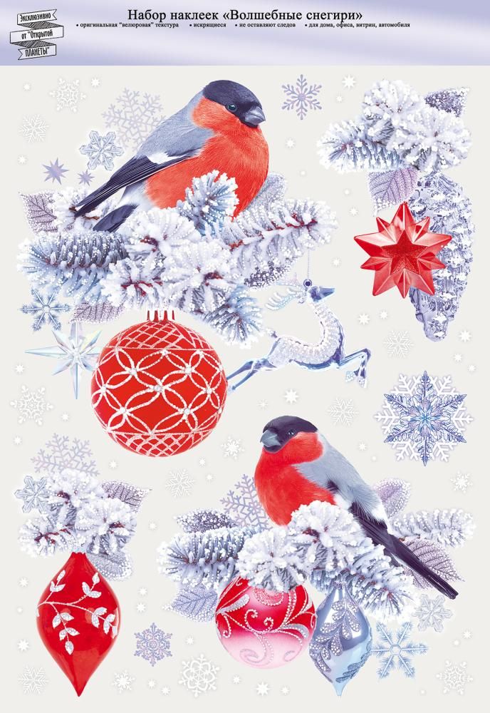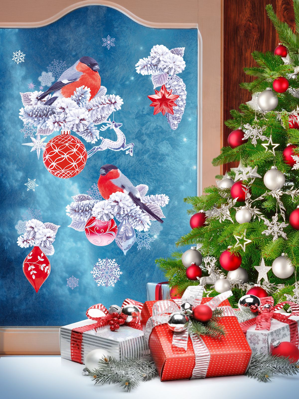 Сверкающие наклейки для праздничного декора! Белоснежный рисунок этих наклеек словно создан из искрящихся снежинок. Блестки придают сияние и эффектно сочетаются со специальным покрытием, имитирующим настоящий снег. А красные грудки снегирей и алые елочные игрушки создают яркие акценты в интерьере. Наклейки подходят для любых гладких поверхностей (кроме бумажных обоев). Кроме того, они двусторонние – а это удачное решение для декорирования окон, витрин, стеклянных дверей. Они одинаково эффектно смотрятся и изнутри, и снаружи. Легко клеятся и легко снимаются. Влагостойкие.