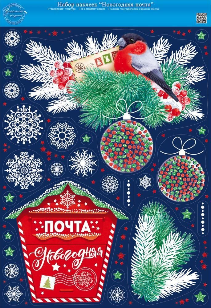 Наклейка оформительская формата А3 «Новогодняя почта» выполнена из самоклеящейся пленки и представляет собой набор отдельных элементов на общем листе: почтовый ящик с надписью «Почта новогодняя», новогодние шары, еловые и снежные ветви, снегирь с конвертом, снежинки и декоративные звезды. Изделие рассчитано на оформление витрин, входных групп, офисных и торговых помещений, учебных заведений, а также жилых интерьеров в период новогодних и зимних акций. Материал обладает достаточной плотностью для сохранения формы наклеек и удобства монтажа, клейкий слой обеспечивает надежное сцепление с гладкими поверхностями стекла, пластика, ламинированных панелей и окрашенных основ. Двустороннее изображение делает наклейку особенно удобной для размещения на стеклянных перегородках и витринах, обеспечивая читаемость композиции как со стороны помещения, так и с улицы, что важно при оформлении торговых залов и входных зон. Поверхность декора дополнительно оформлена красными и зелеными блестками в лаке и пластизольными элементами, за счет чего создается рельефный глянцевый эффект, устойчивый к выцветанию при стандартном искусственном освещении и кратковременном воздействии солнечного света изнутри помещения. Габаритные размеры готового изделия составляют 485 × 332 мм, что позволяет планировать размещение на стандартных витринных модулях и дверных полотнах, а также эффективно комбинировать наклейку с другими элементами сезонного оформления. Лист поставляется в количестве 1, удобен для штучной выкладки и фасовки в коробах, не требует сложных условий хранения, сохраняет потребительские свойства при аккуратной транспортировке в горизонтальном положении. Для розничного использования наклейка подходит для временного декора окон, дверей, фасадов шкафов и рабочих поверхностей в доме или офисе; отдельные элементы можно располагать раздельно, формируя собственные композиции в зависимости от площади и задач оформления.