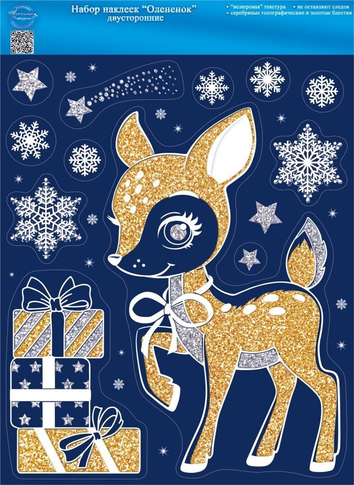 Наклейка оформительская формата А4 изготовлена из самоклеящейся пленки с двусторонним изображением, что обеспечивает одинаково аккуратный вид композиции с обеих сторон стеклянных и прозрачных поверхностей. Размер готового изделия 332 × 242 мм позволяет использовать наклейку как самостоятельный элемент оформления витрины, входной группы, торгового стеллажа или интерьерной зоны без дополнительного декора. В упаковке 1 элемент, что удобно для поштучного учета и формирования ассортимента по позициям. Пленка имеет декоративную отделку с блестками в лаке и пластизольным слоем, за счет чего создается выраженный фактурный эффект и устойчивый глянец; такие покрытия хорошо переносят кратковременное механическое воздействие при наклеивании и сухой уход. Композиция построена на новогодней тематике: центральный персонаж — олёнок в сочетании с подарочными коробками, звездочками, снежинками и падающей звездой, при этом текстовые надписи отсутствуют, что делает оформление универсальным для любых зимних и праздничных сценариев, в том числе для сетевых магазинов с единым визуальным стандартом и для многоязычных площадок. Наклейка предназначена для временного оформления гладких, чистых и сухих поверхностей: витрин, окон, межкомнатных стеклянных перегородок, глянцевых панелей, дверей, мебели и рекламных конструкций внутри помещений. Для оптового заказчика важна стабильность размеров листа А4, что упрощает выкладку и хранение на складе, а также позволяет рационально планировать витринные выкройки и комбинировать данную позицию с другими наклейками аналогичного формата. Двустороннее исполнение уменьшает потребность в дополнительных декоративных элементах при оклейке стекла, так как изображение остается читаемым как с внутренней, так и с наружной стороны. Для розничного покупателя изделие удобно тем, что не требует специального инструмента: наклейка легко отделяется от подложки, ровно ложится на поверхность, при аккуратном снятии не оставляет заметных следов клея и может использоваться для сезонного декорирования дома, офиса, детских учреждений или небольших торговых точек.