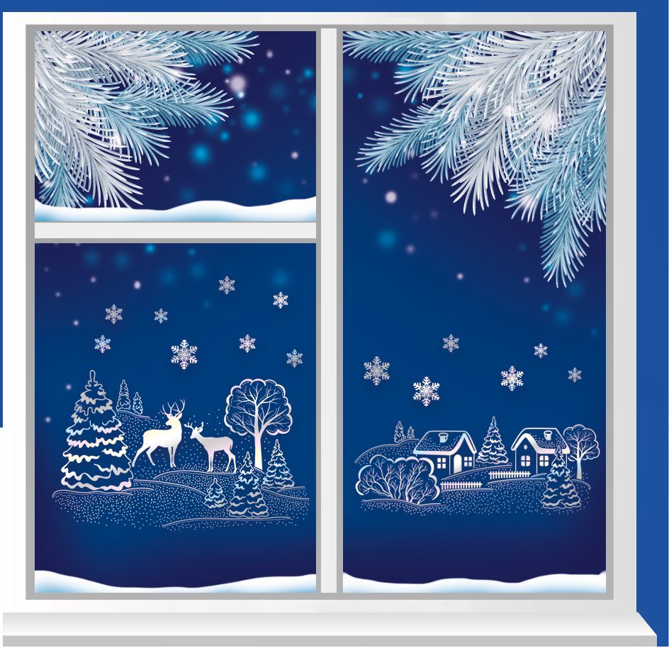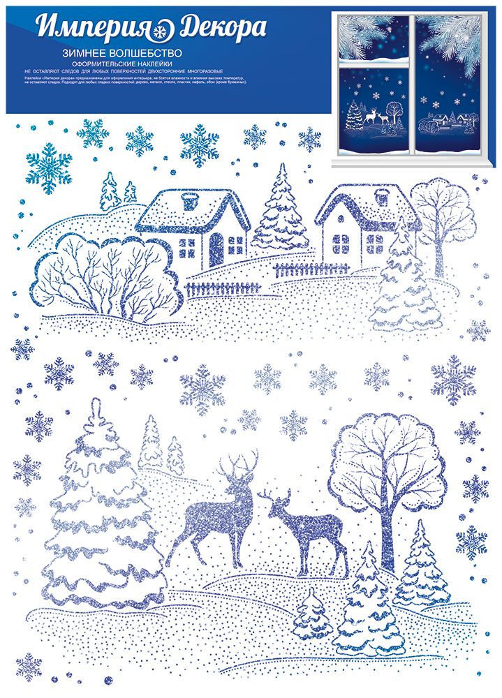 Наклейка оформительская «Зимнее волшебство» предназначена для сезонного оформления витрин, окон, входных групп и интерьерных поверхностей в торговых залах, офисах, кафе, а также в жилых помещениях. Изделие выполнено из самоклеящейся пленки с двусторонним изображением зимнего пейзажа: домики, деревья, еловые ветви, силуэты оленей и рассыпанные по полю снежинки образуют целостную композицию, хорошо читаемую как с внутренней, так и с внешней стороны стекла. Размер готового изделия 332 × 237 мм обеспечивает удобную интеграцию в стандартные оконные проемы и на гладкие панели без необходимости дополнительной подрезки; формат А4 упрощает хранение, учет и выкладку в торговом зале. В оформлении используется серебряная голографическая фольга, за счет которой рисунок заметен при различном освещении и создает эффект мерцания без применения подсветки. Пленка обладает достаточной плотностью для стабильного прилегания к стеклу, пластику и другим ровным непористым поверхностям, при этом тонкая структура не утолщает плоскость и не мешает закрыванию окон и дверей. Клеевой слой рассчитан на временное сезонное использование, допускает аккуратное удаление без видимых следов и не требует применения дополнительных клеящих материалов. Отсутствие надписей делает наклейку универсальной для сетей с разными языковыми требованиями и позволяет использовать ее как фоновый элемент при оформлении акций, новогодних витрин и праздничных фотозон. В розничном применении изделие подходит для декорирования окон в квартирах и домах, детских комнат, школьных классов и кружков: композиция может располагаться единым блоком либо комбинироваться с другими элементами зимней тематики. Упаковка содержит 1 наклейку, компактный плоский формат снижает риск деформации при транспортировке и позволяет оптимизировать складское пространство при крупнооптовых поставках.