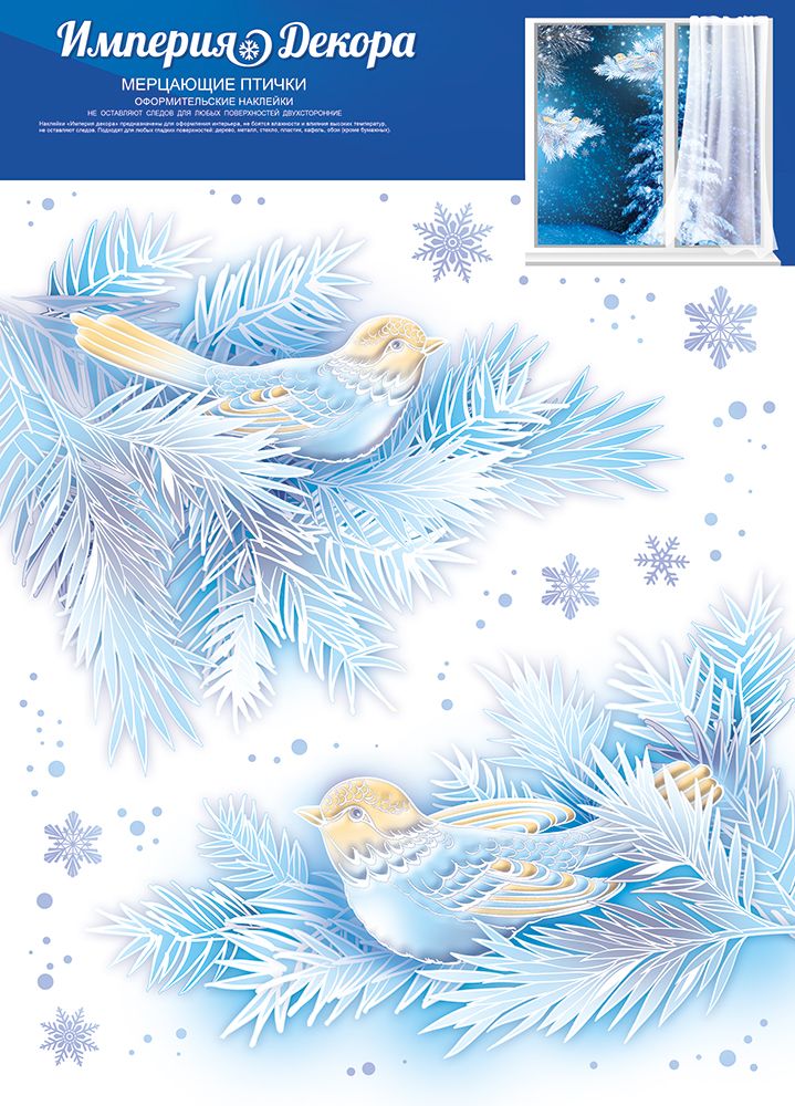 Наклейка оформительская «Мерцающие птички» предназначена для сезонного и праздничного декорирования интерьеров и витрин, ориентирована на использование в розничной торговле, офисных и образовательных пространствах, а также в домашнем оформлении. Изделие выполнено из самоклеящейся пленки с двусторонним изображением зимних ветвей и птиц в холодной голубой гамме, что обеспечивает одинаково выразительный вид как с внутренней, так и с внешней стороны остекления. Формат А4 и готовые габариты 332 × 237 мм позволяют планировать выкладку и транспортировку при оптовых закупках, удобно компонуя товар на стеллажах, в напольных и настенных выкладках, а также в почтовых и курьерских отправлениях. Фигурная вырубка облегчает отделение элементов от подложки и ускоряет оформление больших площадей, что актуально для сетевых магазинов, кафе, салонов и других объектов с повторяемым декором. Поверхность дополнительно обработана радужными блестками в лаке, за счет чего создается мерцающий эффект при искусственном и дневном освещении, без использования электроэнергии и дополнительного оборудования; отделка устойчива к умеренному механическому воздействию при стандартной эксплуатации. Самоклеящаяся пленка рассчитана на ровные, гладкие, непористые основания: стекло, зеркала, глянцевые панели, ламинированные поверхности; при аккуратном снятии не оставляет заметных следов клея и не требует специальных средств для удаления. Отсутствие текста и надписей делает наклейку универсальной для различных языковых регионов и сценариев применения, включая новогоднее и зимнее оформление, тематические фотозоны, рекламные композиции и детские помещения. Небольшое количество элементов в листе упрощает учет остатков, фасовку и переупаковку при оптовой торговле, а также снижает риск повреждения при хранении. В упаковке 1.