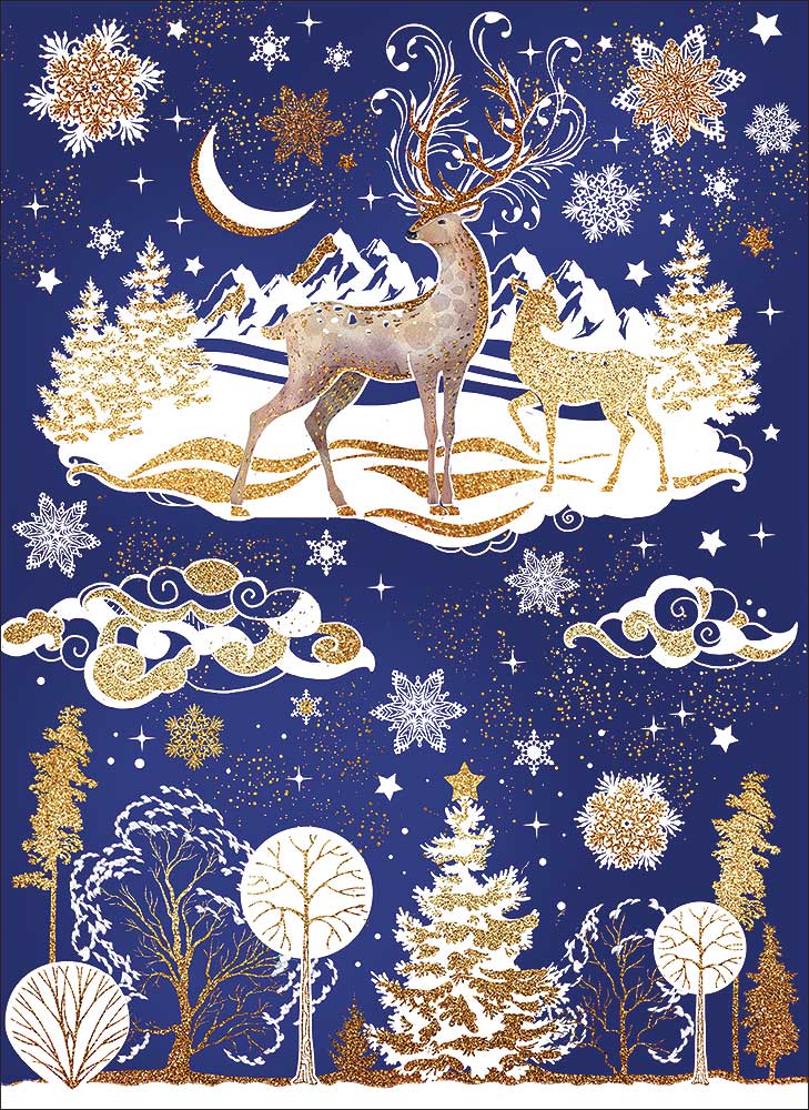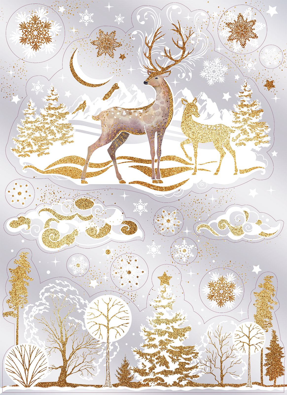 Наклейка оформительская формата А1 изготовлена из самоклеящейся плёнки с двусторонним изображением зимнего пейзажа: силуэты оленей на фоне гор, хвойные и лиственные деревья, облака, звёзды и снежинки. Все элементы имеют фигурную вырубку, что позволяет использовать их как единый сюжет или как набор отдельных декоративных модулей для витрин, стёкол дверей, перегородок, зеркал и гладких интерьерных поверхностей. Размер готового изделия 672 × 489 мм обеспечивает хорошую читаемость рисунка с расстояния, что важно при оформлении торговых залов, офисов, зон приёмки клиентов и небольших витрин. В отделке применены золотые блёстки в лаке, создающие мерцающий эффект при искусственном и дневном освещении; покрытие фиксировано в лаковом слое, что снижает осыпание и повышает износостойкость при сезонной эксплуатации. Самоклеящаяся основа рассчитана на одноразовое наклеивание, обеспечивает надёжную адгезию к ровным, обезжиренным поверхностям и позволяет монтировать изделие без дополнительного инструмента; при аккуратном снятии риск следов клея на большинстве непористых оснований минимален. Двусторонний рисунок делает наклейку функциональной при размещении на стеклянных перегородках и витринах, где изображение должно быть одинаково выразительным как изнутри, так и снаружи помещения. В розничном использовании изделие подходит для сезонного декора окон в квартирах, частных домах, учебных и детских учреждениях, при этом формат листа удобен для хранения в плоском виде и транспортировки без деформации. В упаковке 1.