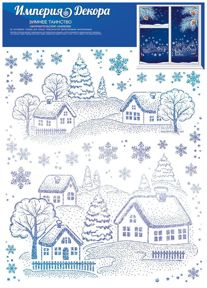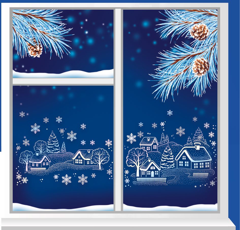Наклейка оформительская формата А4 представляет собой лист самоклеящейся пленки с двусторонним изображением зимнего пейзажа: домики, деревья, сугробы и отдельные снежинки различного размера, выполненные в холодной голубой гамме. Размер готового изделия 332×237 мм обеспечивает хорошую закрывающую площадь при оформлении витрин, оконных проемов, дверных полотен, зеркал и других гладких поверхностей. Материал – тонкая эластичная самоклеящаяся пленка, адаптированная для наклеивания на стекло и аналогичные основания без применения дополнительных клеевых составов, что удобно при массовом сезонном оформлении торговых залов, офисов, кафе, учебных и детских учреждений. Двустороннее изображение позволяет использовать наклейку на прозрачных поверхностях с сохранением декоративного эффекта как изнутри, так и снаружи, что важно при оформлении витрин и панорамных окон. Отделка выполнена с применением серебряной голографической фольги, за счет чего элементы рисунка дают выразительный блеск и мерцание при искусственном и дневном освещении; это повышает заметность декора с расстояния и делает изделие пригодным для витринных композиций и серийных выкладок. Отсутствие текста и надписей делает наклейку универсальной: один и тот же артикул подходит для новогоднего, зимнего и тематического оформления в различных форматах торговли и сервиса без привязки к конкретной дате или языку. Конструкция листа рассчитана на аккуратное отделение элементов вручную, без дополнительной подрезки, что снижает время монтажа при больших объемах работ и уменьшает количество отходов. Пленка устойчива к кратковременному воздействию влаги и бытового конденсата на стекле, не теряет рисунок при нормальной эксплуатации в отопительный сезон, при этом после снятия не должна оставлять выраженных следов клеевого слоя при соблюдении рекомендаций по наклеиванию. Упаковка содержит 1 единицу изделия, удобна для поштучного отпуска и формирования смешанных ассортиментов зимнего декора. Для розничного пользователя наклейка подходит для быстрого оформления окон в квартире, доме или небольшом офисе, позволяет визуально объединить пространство комнаты, не требует специальных инструментов и может быть размещена и демонтирована в пределах одного сезона без повреждения поверхности.