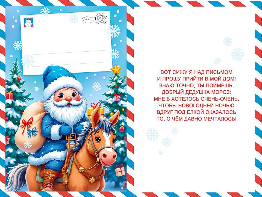 Почта Деда Мороза формата А5 представляет собой готовое печатное изделие из плотного картона с полноцветным двусторонним оформлением и заранее нанесённым текстом, предназначенное для оформления детских писем и новогодних пожеланий. Габариты готового изделия составляют 182 × 122 мм, что обеспечивает совместимость с распространёнными конвертами и удобство выкладки на полке, в напольных и прикассовых дисплеях. Материал основы подобран с учётом серийного использования в розничных сетях и оптовых поставках: картон сохраняет форму, не деформируется при аккуратной транспортировке, выдерживает стандартные условия складского хранения и многократные перекладки при формировании ассортимных наборов к сезону. Лицевая сторона оформлена яркой новогодней иллюстрацией с Дедом Морозом, елью и подарками, что делает изделие визуально заметным в общей выкладке поздравительной и праздничной продукции и облегчает формирование однородной новогодней линейки. Поверхность дополнительно обработана глянцевым УФ-лаком, за счёт чего изображение устойчиво к истиранию, не выцветает при кратковременном воздействии света, а сама карточка меньше подвержена загрязнениям и появлению заломов по краям при аккуратном использовании. Наличие готового текста упрощает использование изделием в детских коллективах, кружках, школах и при проведении массовых новогодних мероприятий: достаточно вписать имя ребёнка, пожелания и подпись, без необходимости разрабатывать содержание с нуля. Для частных покупателей изделие подходит как индивидуальное письмо Деду Морозу, как элемент подарочного набора или дополнение к основному презенту. Компактный размер облегчает хранение упаковок на складе и транспортировку оптовых партий, позволяет формировать сезонные промо-наборы, комбинировать позицию с конвертами, открытками и новогодними пакетами. В упаковке — 10 изделий, что удобно для планирования закупок, расчёта витринной выкладки и распределения по торговым точкам в период новогоднего спроса.