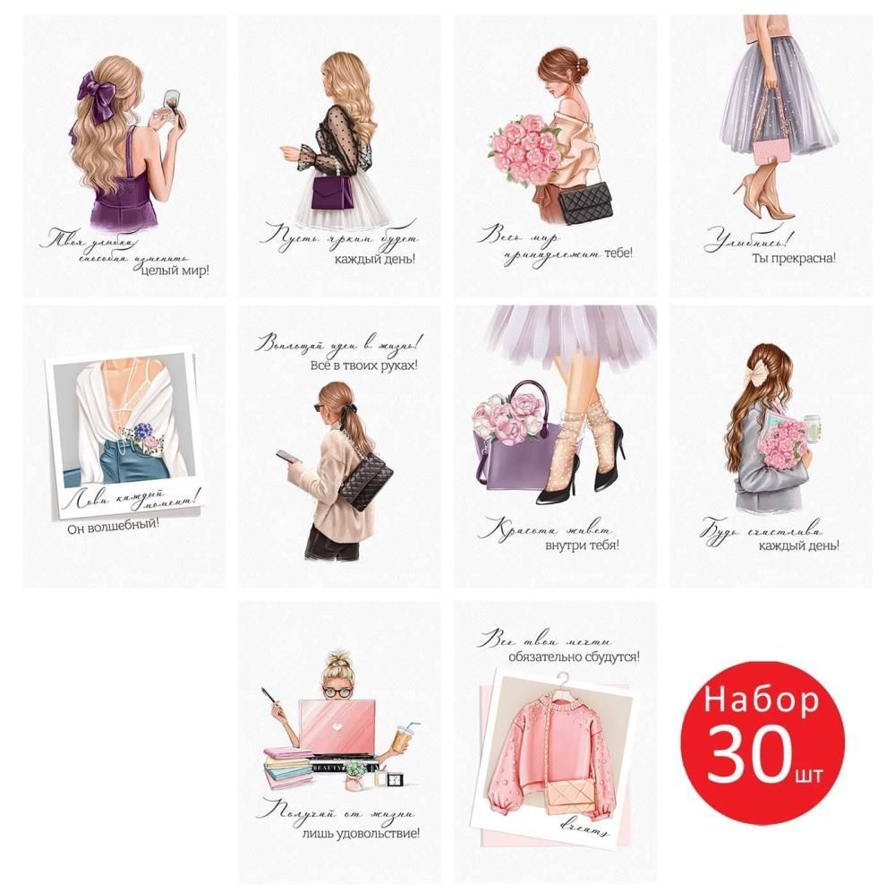 Набор открыток формата А7 предназначен для розничной и оптовой продажи как готовое решение для поздравлений и оформления подарков в женской и молодежной тематике. В комплект входит 30 отдельных элементов размером 100 × 70 мм, выполненных из плотного картона, что обеспечивает стабильную форму, аккуратный внешний вид и устойчивость к сгибам при стандартной эксплуатации и пересылке. Лицевая сторона каждой открытки содержит полноцветное изображение в единой стилистике: иллюстрации девушек, аксессуаров и цветов с короткими мотивационными и поздравительными фразами, выдержанными в современном графическом оформлении. Внутренняя сторона без текста, оставлена пустой для самостоятельного внесения надписей, что упрощает адаптацию под разные случаи: дни рождения, личные поздравления, небольшие комплименты, поощрения, вложения к подарочным сертификатам и сувенирам. Отсутствие отделки делает поверхность удобной для письма любыми распространенными видами ручек и маркеров, а также облегчает хранение и штабелирование при оптовых поставках. Компактный формат А7 позволяет использовать открытки как самостоятельный мини-подарок, как вложение в упаковку, конверт или коробку, а также как декоративный элемент при оформлении витрин, подарочных наборов и тематических мероприятий. Нейтральная, но узнаваемая визуальная концепция облегчает включение набора в широкий ассортимент подарочной продукции, канцтоваров, сопутствующих товаров в магазинах одежды, косметики и аксессуаров. Стандартные размеры и материал способствуют рациональной логистике: открытки удобно фасовать, перевозить и хранить без риска деформации при соблюдении обычных условий складирования. Набор из 30 штук подходит для плановых закупок, формирования серийных подарочных предложений и равномерного расходования в течение сезона.