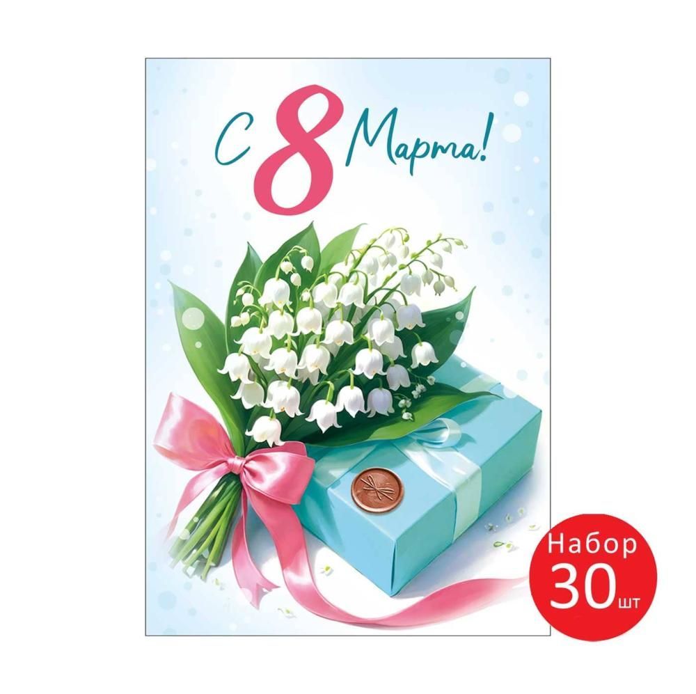 Набор открыток формата А7 предназначен для массового поздравления с 8 Марта в торговых и сервисных организациях, офисах и учреждениях. В комплект входит 30 однотипных открыток размером 100×70 мм, изготовленных из плотного картона, что обеспечивает достаточную жесткость, устойчивость к изгибам и сохранение формы при транспортировке и хранении. Лицевая сторона оформлена полноцветным изображением подарочной коробки с розовым бантом и букетом ландышей на светлом фоне, дополненным надписью «С 8 Марта!», что делает изделие готовым к использованию без необходимости дополнительного декора. Внутренняя сторона без текста, с чистым полем для рукописного поздравления, печати фирменного штампа или нанесения индивидуального сообщения, что удобно при работе с корпоративными клиентами и партнерами. Отделка без отделки обеспечивает нейтральный внешний вид, уменьшает риск бликов при освещении и упрощает хранение в стопках и коробах. Компактный формат позволяет размещать открытки на кассовых зонах, витринах, в почтовых рассылках и вложениях к подаркам, не увеличивая объем и вес отправлений. Набор удобен для оптовых закупок к праздничному сезону: одинаковый дизайн облегчает планирование ассортимента, а стандартные размеры совместимы с типовыми конвертами и упаковкой. Для розничного покупателя такой комплект подходит для оформления поздравлений коллег, одноклассниц, клиенток или родственниц, а также для дополнения небольших подарков, цветов и сувенирных наборов, обеспечивая единый стиль поздравления и аккуратный внешний вид при минимальных временных затратах.