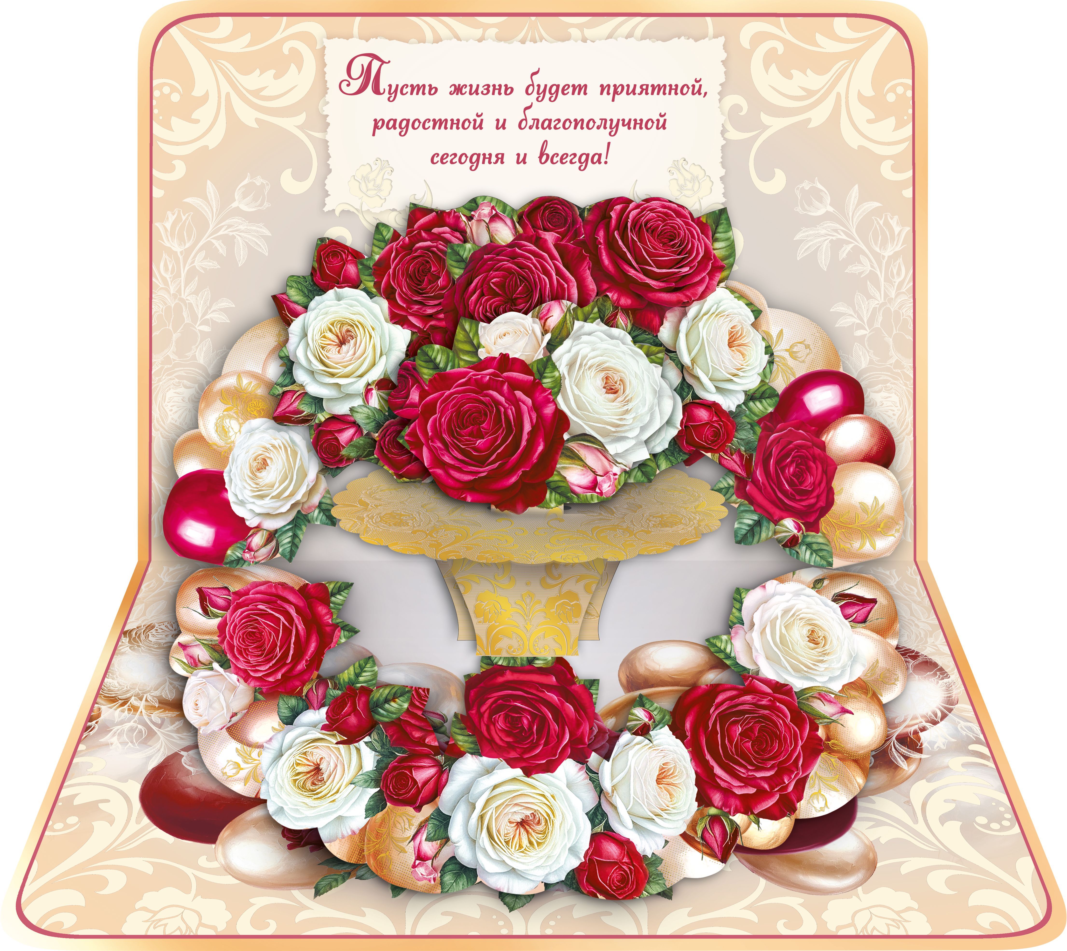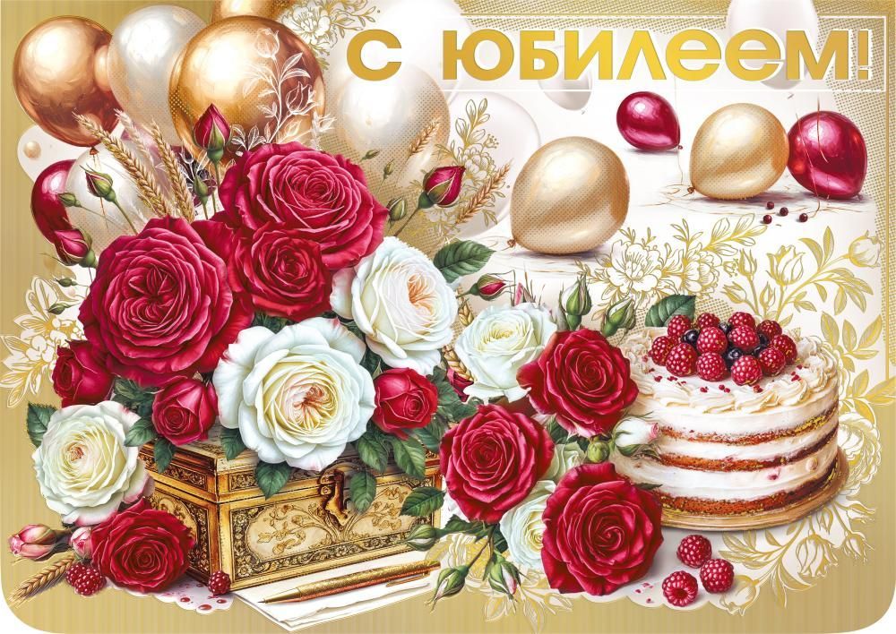 Открытка-поздравление «С юбилеем» (Розы, шарики и торт)