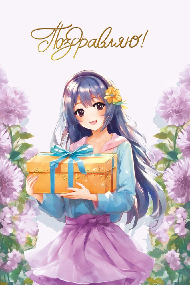 Открытка формата А5 изготовлена из плотного дизайнерского картона, обеспечивающего стабильную геометрию и устойчивость к изгибам при транспортировке и хранении в складских условиях. Готовое изделие имеет размеры 182 × 122 мм, что удобно для сортировки по стандартным ячейкам стеллажей, укладки в короба и использования в комбинированных выкладках с другими бумажными товарами аналогичного формата. Лицевая сторона оформлена полноцветной печатью с изображением персонажа в аниме-стилистике с подарочной коробкой на фоне цветочного оформления, в верхней части размещена надпись «Поздравляю!» с применением золотой фольги. Фольгирование придаёт надписи чёткий контур и устойчивый металлический блеск, не смазывается при касании и не отслаивается при стандартной эксплуатации, что важно при интенсивном листовом обороте в рознице и при пересортице в оптовых партиях. Внутри открытки расположен заранее напечатанный поздравительный текст, позволяющий использовать изделие без дополнительной доработки, что сокращает время обслуживания клиентов в магазинах и упрощает выбор для конечного покупателя. Дизайнерский картон обеспечивает хорошую непрозрачность и стабильность цвета, не деформируется при нормальной влажности и выдерживает хранение в стопках без образования заломов по краю. Открытка подходит для поздравления с днём рождения и другими личными событиями, ориентирована на молодёжную аудиторию и любителей современного иллюстративного стиля, может использоваться как самостоятельный элемент подарка или в составе готовых подарочных наборов. Количество в упаковке: 10. Такой объём удобен для оптовых закупок в сетевые и несетевые магазины, сувенирные отделы, канцтовары и интернет-ритейл, позволяя планировать товарные остатки и поддерживать стабильный ассортимент поздравительных открыток с единым визуальным стилем.