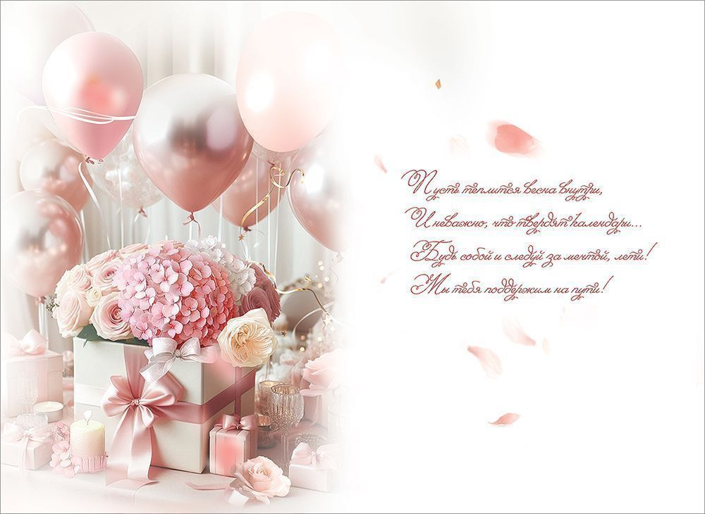 Открытка формата А5 предназначена для поздравления с 40‑летием и ориентирована на использование в розничной продаже и оптовых поставках для магазинов подарочной продукции, книжных сетей и сувенирных отделов. Изделие изготовлено из плотного картона, что обеспечивает стабильную геометрию, устойчивость к деформации при транспортировке и хранении, а также аккуратный внешний вид на витрине и при вручении. Габариты готового изделия 182 × 126 мм позволяют размещать открытку в стандартных витринных и почтовых форматах, удобно комплектовать с конвертами и подарочными пакетами. Лицевая сторона оформлена сюжетной композицией в розово‑золотистой гамме: цветочная композиция, подарочные коробки, свечи и воздушные шары с крупной надписью «С Днём рождения! 40», что делает назначение изделия однозначным и снижает риск ошибки при подборе ассортимента. В оформлении применены блестки в лаке радужные, создающие выразительный декоративный эффект при искусственном и дневном освещении, устойчивые к осыпанию при обычной эксплуатации и многократных перекладках в торговом зале. Внутри предусмотрен поздравительный текст, что позволяет использовать открытку без дополнительного оформления, экономя время конечного покупателя и повышая оборачиваемость товара. Картонная основа хорошо держит сгиб, не растрескивается по линии фальца и сохраняет читаемость печати при длительном хранении. Открытка поставляется по 10 штук, что удобно для формирования заказов, выкладки по цветовым и возрастным линейкам и планирования складских остатков. Изделие подходит для использования как самостоятельное поздравление, так и в составе подарочного набора, гармонично сочетается с упаковкой в пастельных и нейтральных оттенках, что упрощает формирование универсального ассортимента ко дню рождения в возрасте 40 лет.