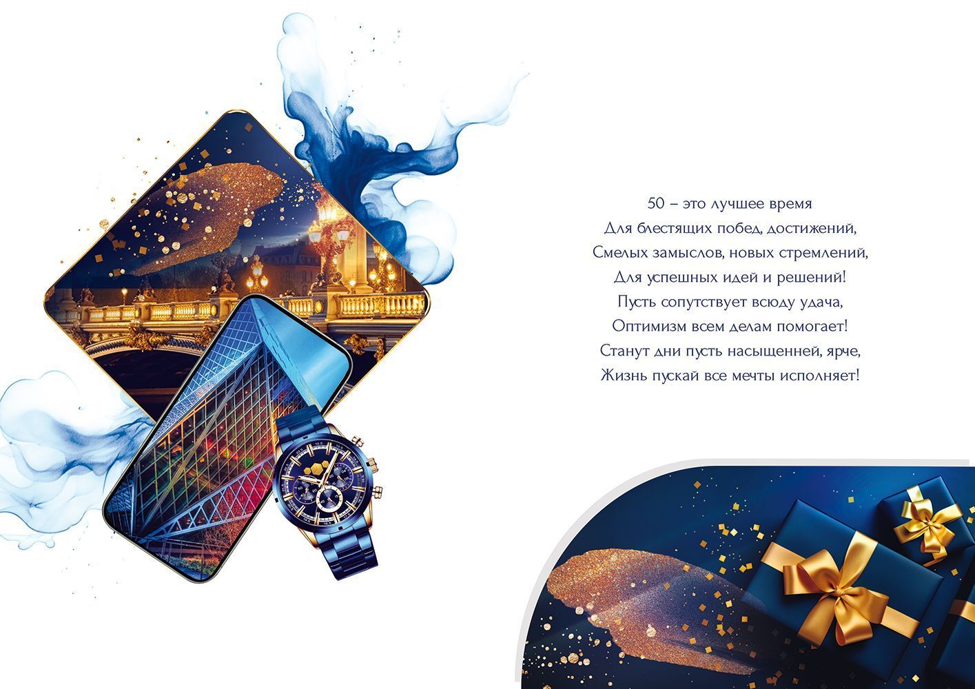 Открытка формата А4 предназначена для поздравления с 50‑летним юбилеем и ориентирована на использование в качестве подарочного носителя вместе с денежным вложением. Изделие выполнено из плотного картона, обеспечивающего стабильную геометрию и устойчивость к изгибам при хранении и пересылке. Размер готового изделия составляет 277 × 196 мм, что удобно для размещения внутри стандартных конвертов увеличенного формата или вручения без дополнительной упаковки. Конструктив с карманом/клапаном для денег позволяет аккуратно и надежно закрепить купюры или подарочный сертификат, исключая их смещение и выпадение. На лицевой стороне используется полноцветная печать с крупной цифровой надписью «50» и надписью «С Юбилеем!», визуально выделяющей повод вручения; композиция дополнена изображениями подарков, часов, автомобиля и городской архитектуры, что делает открытку универсальной для поздравления мужчин в деловой и неформальной среде. Отделка выполнена с применением глянцевого УФ‑лака и золотой фольги: лак повышает износостойкость изображения, устойчивость к истиранию и влаге, а фольгирование придает акцент важным элементам дизайна и улучшает читаемость надписей при разном освещении. Внутри размещен печатный поздравительный текст, что сокращает время подготовки к вручению и снижает нагрузку на персонал торговых точек и корпоративных отделов закупок; при необходимости остается свободное поле для личной подписи. Фигурная вырубка по контуру придает изделию законченный презентационный вид и облегчает визуальное позиционирование в витрине. Открытка поставляется по 10 штук в упаковке, что удобно для формирования оптового ассортимента, планирования остатков и выкладки по тематике «Юбилей 50 лет». Плоская форма и стандартные габариты способствуют рациональному использованию складского пространства, упрощают транспортировку коробами и минимизируют риск повреждений при групповой отгрузке.