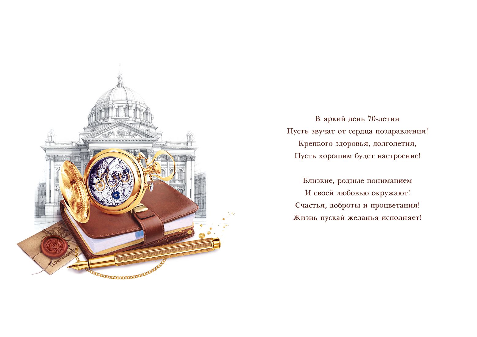Открытка формата А4 предназначена для поздравления с 70‑летним юбилеем и ориентирована на использование в розничной продаже и оптовых поставках для торговых сетей, канцелярских отделов и корпоративных клиентов. Основа изделия выполнена из плотного картона, обеспечивающего стабильную геометрию, устойчивость к изгибам и сохранность внешнего вида при хранении и транспортировке крупными партиями. Готовый размер открытки составляет 277 × 196 мм, что позволяет размещать её в стандартных конвертах соответствующего формата и удобно выкладывать на витрине. Лицевая сторона оформлена в деловой юбилейной стилистике: крупная надпись «С Юбилеем!» и число «70» дополнены изображениями классической архитектуры, часов, ежедневника и письменных принадлежностей, что делает открытку уместной для поздравления как в личном, так и в официальном, корпоративном формате. Используется золотая фольга, за счёт которой отдельные элементы композиции и надписей имеют выраженный металлический блеск и визуально выделяются при искусственном и дневном освещении; покрытие устойчиво к истиранию при стандартной эксплуатации и не отслаивается при сгибе. Внутри предусмотрен заранее напечатанный поздравительный текст, что сокращает время подготовки к вручению и удобно при массовых закупках для организаций, где требуется единый стиль поздравления сотрудников, партнёров или клиентов. Плотный картон позволяет открытке сохранять форму при вертикальной установке на столе или полке, не прогибается под собственным весом и не деформируется при кратковременном контакте с влагой. Изделие поставляется по 10 штук, что оптимально для формирования ассортимента по возрастным юбилейным позициям, облегчает учёт на складе и планирование закупок. Открытка подходит для продажи поштучно, для формирования подарочных наборов, а также для включения в корпоративные поздравительные пакеты, обеспечивая единый визуальный уровень оформления и предсказуемое качество исполнения.