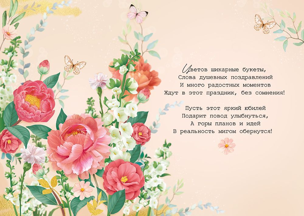 Открытка формата А4 предназначена для поздравления с юбилеем и ориентирована на использование в ассортименте магазинов, торговых сетей и компаний, формирующих расширенную линейку праздничной полиграфии. Изделие выполнено из плотного картона, что обеспечивает стабильную геометрию при размерах 277 × 196 мм, устойчивость к изгибам и сохранение формы при транспортировке и выкладке на стеллажах. Лицевая сторона оформлена крупной надписью «С Юбилеем!» на декоративной золотистой плашке, дополненной золотой фольгой, а также текстом пожелания «Чудесного настроения!» и композициями из детализированных цветочных иллюстраций с преобладанием пионов и других садовых цветов. Фольгирование выполнено точечно по отдельным элементам дизайна, за счет чего открытка имеет аккуратные бликующие акценты без утолщения слоя и риска отслаивания при стандартных условиях хранения. Внутри размещен поздравительный текст, позволяющий использовать изделие без дополнительной подготовки, что удобно как для розничного покупателя, так и для корпоративных заказов, когда требуется единый стиль поздравления большого числа адресатов. Картонная основа пригодна для нанесения шариковой или гелевой ручкой, не дает сильного просвечивания чернил и позволяет дописать персональные пожелания. Открытка подходит для продажи поштучно и формирования тематических выкладок ко дню рождения и юбилеям различного уровня, вписывается в стандартные витринные решения по высоте и ширине, легко комплектуется с конвертами соответствующего формата. Поставляется по 10 штук, что удобно при планировании закупок, формировании запаса на сезонный спрос и оптимизации складского хранения в оптовом сегменте.
