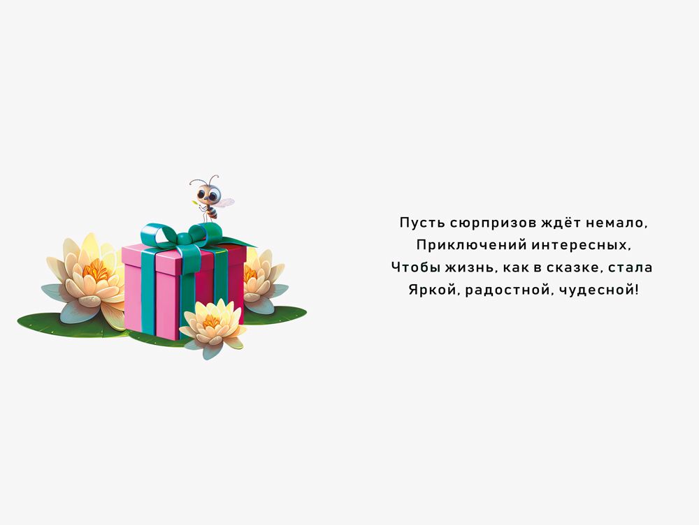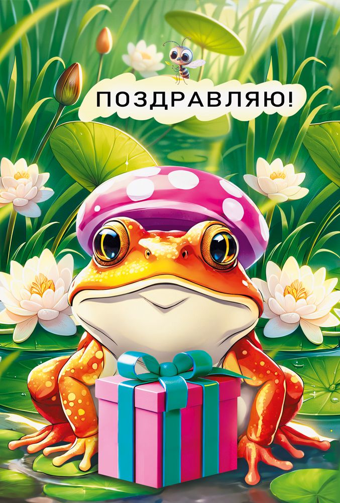 Открытка формата А5 изготовлена из плотного картона и рассчитана на интенсивное использование в розничном и подарочном ассортименте. Размер готового изделия 182 × 122 мм обеспечивает совместимость с большинством стандартных конвертов и удобство размещения на витринах, в напольных и настольных стойках, а также в почтовых отправлениях. Лицевая сторона оформлена полноцветным изображением: яркая иллюстрация с лягушкой с подарком на фоне водных растений и надписью «Поздравляю!» делает открытку универсальной для дня рождения, личных праздников, детских мероприятий и корпоративных поздравлений в неформальном стиле. Печать выполнена с применением глянцевого УФ-лака, что повышает стойкость красочного слоя к истиранию, выцветанию и воздействию влаги, облегчает сухую очистку поверхности и придаёт изображению выраженный защитный и декоративный эффект без дополнительной отделки. Внутри предусмотрен заранее напечатанный текст поздравления, что сокращает время подготовки к вручению и удобно при массовых поздравлениях сотрудников, клиентов или партнёров; при необходимости остаётся место для личной подписи и краткого обращения. Картонная основа держит форму, не деформируется при стандартных условиях хранения и транспортировки, подходит для длительного складского запаса и выкладки в самообслуживаемых зонах. Открытка поставляется упаковками по 10, что удобно для учёта, планирования закупок и формирования полочного ассортимента в магазинах, киосках, сувенирных и канцелярских отделах, а также для закупок организациями и частными лицами при подготовке к мероприятиям. Универсальная тематика и нейтральный текст позволяют включать данную открытку в базовую линейку поздравительной продукции на круглый год.