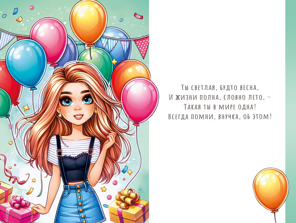 Открытка формата А5 «Любимой внучке» предназначена для розничной продажи и оптовых поставок в сегменте праздничной полиграфии. Изделие выполнено из плотного картона, обеспечивающего стабильную геометрию при хранении и транспортировке, а также устойчивость к изгибам и износу при многократном перелистывании. Габаритные размеры готовой открытки составляют 182×122 мм, что соответствует стандартному формату для размещения в витринных стойках, настольных дисплеях и почтовых конвертах подходящего размера. Лицевая сторона оформлена цветной иллюстрацией с изображением современной девочки на фоне воздушных шаров и подарков, композиция дополнена крупной надписью «Любимой внучке», хорошо читаемой с расстояния и удобной для выкладки в торговом зале. Для повышения износостойкости и визуальной выразительности используется глянцевый УФ-лак, который защищает красочный слой от истирания, выгорания и мелких механических повреждений, сохраняет яркость оттенков при длительном экспонировании под освещением. Внутри открытки размещен готовый поздравительный текст, что упрощает выбор для розничного покупателя и сокращает время обслуживания в точках продаж: изделие не требует дополнительного заполнения, но при необходимости оставляет свободное место для личной подписи. Конструкция открытки стандартная книжная, что удобно для фасовки, штабелирования и упаковки в термоусадочную пленку или коробочные наборы. В упаковке 10 одинаковых открыток, что позволяет оптимизировать складские остатки, упростить учет и планирование ассортимента по праздничной тематике «для внучки». Изделие подходит для поздравления с днем рождения, окончанием учебного года и другими семейными событиями, может использоваться как самостоятельный подарок-compliment или как дополнение к основному презенту, органично сочетаясь с подарочными пакетами и коробками благодаря универсальной яркой цветовой гамме.