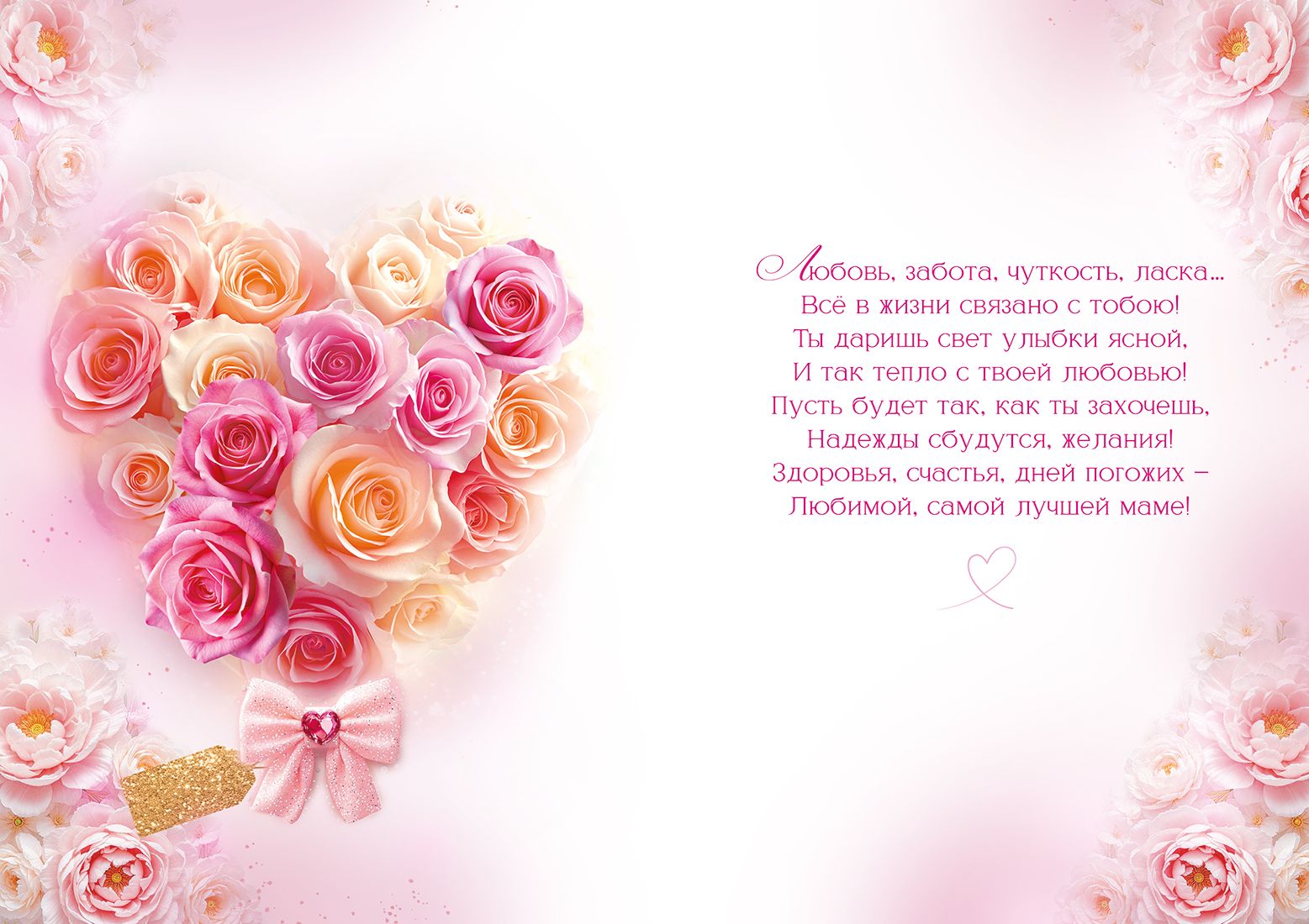 Открытка формата А4 предназначена для поздравления мамы и ориентирована на использование в праздничном и подарочном ассортименте как в розничной, так и в оптовой продаже. Изделие выполнено из плотного картона, что обеспечивает стабильную геометрию, устойчивость к изгибам и сохранение внешнего вида при транспортировке и выкладке. Габаритные размеры готового изделия: длина 277 мм, ширина 196 мм, что позволяет размещать открытку в стандартных витринных модулях и упаковочных пакетах соответствующего формата. Лицевая сторона оформлена крупной композицией из розовых и персиковых роз, собранных в форму сердца, с дополнительными цветочными элементами по периметру; общий фон выдержан в розово-пастельной гамме с плавными переходами. Для акцентирования отдельных деталей применена фольга золотая, создающая блестящие элементы на надписях и декоративных фрагментах, за счет чего открытка хорошо заметна в ряду аналогичных позиций и подходит для выкладки в премиальном сегменте. На лицевой стороне размещен текст «Мамочке с любовью» и «От всего сердца», подобранный в едином стиле с оформлением. Внутри предусмотрен готовый поздравительный текст, что уменьшает время подготовки подарка и делает изделие удобным для покупателей, предпочитающих готовое решение без необходимости самостоятельно составлять пожелания. Картонная основа совместима с большинством стандартных конвертов и упаковки для подарков, не требует специальных условий хранения, устойчива к кратковременному воздействию света и незначительным механическим нагрузкам при аккуратной эксплуатации. Открытка поставляется по 10 штук, что удобно для формирования полочного запаса, планирования сезонных акций, комплектования витринных выкладок ко Дню матери, дню рождения и другим семейным датам, а также для использования в качестве дополнения к цветам и подарочным наборам.