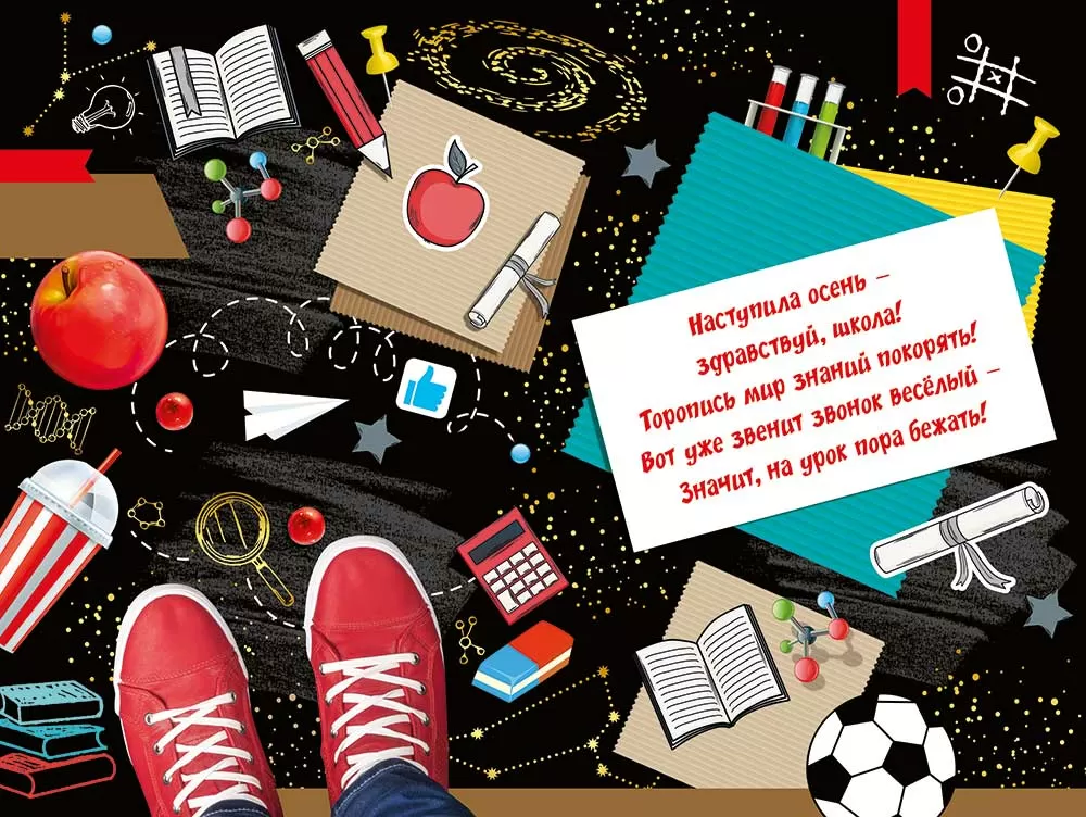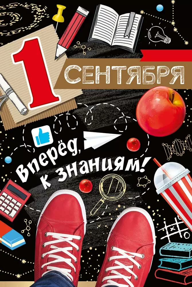 Открытка «1 Сентября! Вперёд к знаниям!» в формате А5 поможет поздравить ребенка с началом учебного года. Стильный дизайн изделия сделает любое поздравление незабываемым! Нарочито небрежные иллюстрации, яркие изображения школьных принадлежностей на темном фоне и задорные надписи одинаково понравятся и малышам в начальной школе, и подросткам в старшей. Внутри открытки – замечательные стихи с напутствием и теплыми пожеланиями. Изделие выполнено из качественных материалов, что обеспечивает ему прочность и долговечность, поэтому оно станет чудесным памятным сувениром для получателя.