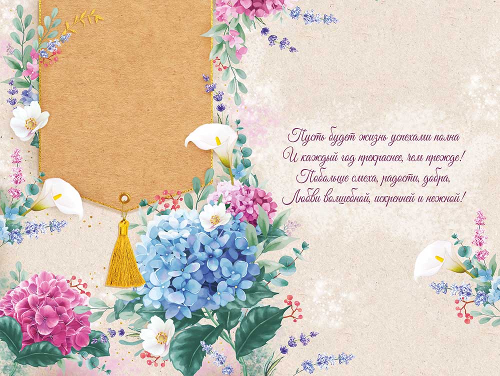 Открытка формата А5 предназначена для поздравления с днем рождения и ориентирована на использование в ассортименте розничных и оптовых продаж. Изделие выполнено из плотного картона, обеспечивающего устойчивость к деформации при транспортировке и хранении, а также сохранение формы при длительном экспонировании на витрине. Размер готового изделия 182 × 122 мм позволяет удобно размещать открытку в стандартных конвертах и на полочных выкладках. Лицевая сторона оформлена полноцветной печатью с детализированным цветочным рисунком и надписью «С Днем Рождения!», дополненной текстовым блоком «Прекрасного настроения!». Визуальный акцент сделан на комбинировании фона под крафт-бумагу, ярких цветочных элементов и декоративного изображения кисточки, что делает открытку универсальной для поздравления как женщин, так и мужчин, в том числе в деловом контексте. Отделка включает блестки в лаке радужные, за счет чего отдельные элементы изображения имеют умеренный глянцевый и мерцающий эффект, устойчивый к истиранию при аккуратном обращении и не влияющий на читаемость текста. Внутри предусмотрен готовый поздравительный текст, что сокращает время подготовки к вручению и удобно при массовых поздравлениях сотрудников, клиентов или партнеров. Плотность и структура картона подобраны таким образом, чтобы открытка сохраняла первоначальный вид при хранении в стопах и стандартных коробах, не расслаивалась и не коробилась при нормальных условиях эксплуатации. Изделие подходит для реализации поштучно и комплектами, оптимально для формирования сезонных и постоянных полочных матриц. В упаковке 10 штук, что упрощает учет, складирование и планирование закупок для торговых точек и корпоративных клиентов.