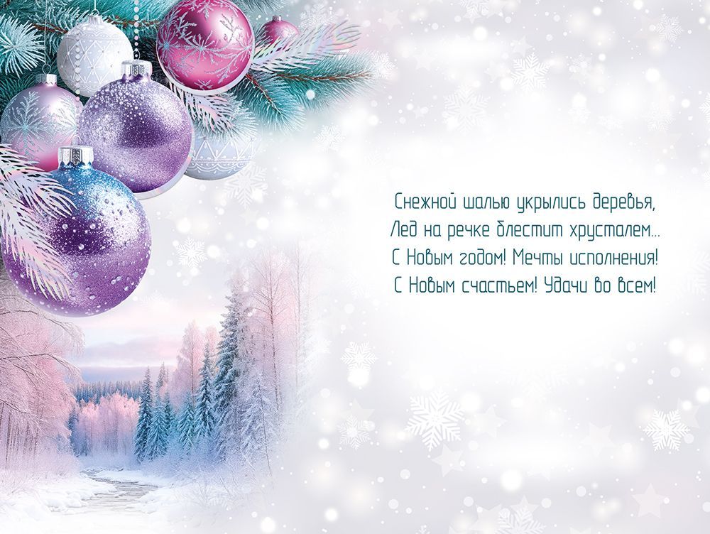 Открытка новогодняя формата А5 предназначена для розничной продажи и оптовых поставок в сезонных и постоянных ассортиментных линейках. Изделие изготовлено из плотного картона, обеспечивающего стабильную геометрию и сохранность формы при хранении, транспортировке и выкладке в торговом зале. Готовый размер 182×122 мм удобен для стандартных конвертов, почтовой пересылки и размещения на витринах. Лицевая сторона оформлена зимним пейзажем с заснеженным лесом и крупными елочными шарами в холодно-розово-фиолетовой гамме, надпись «С Новым годом!» интегрирована в композицию и хорошо читается с расстояния, что важно для визуального восприятия на полке. Применена фольга голографическая серебряная, создающая мерцающие акценты на новогодних игрушках и снежных деталях; такое решение повышает износостойкость лицевой поверхности, устойчивость к истиранию и придает изображению выраженный декоративный эффект при различном освещении, в том числе в витринных и офисных условиях. Внутри открытки размещен заранее напечатанный поздравительный текст, что сокращает время подготовки поздравлений при массовой рассылке, корпоративных вручениях и использовании в качестве вложения к подарочным наборам. Картонная основа оптимальна для нанесения дополнительных рукописных пожеланий шариковой или гелевой ручкой без растекания чернил и деформации листа. Конструкция позволяет хранить продукцию стопками без повреждения краев, что удобно для оптовых складов и транспортных коробов. Открытка подходит для использования в корпоративных новогодних программах, для поздравления партнеров, клиентов и сотрудников, а также для частных поздравлений в семье и кругу друзей. В упаковке 10.