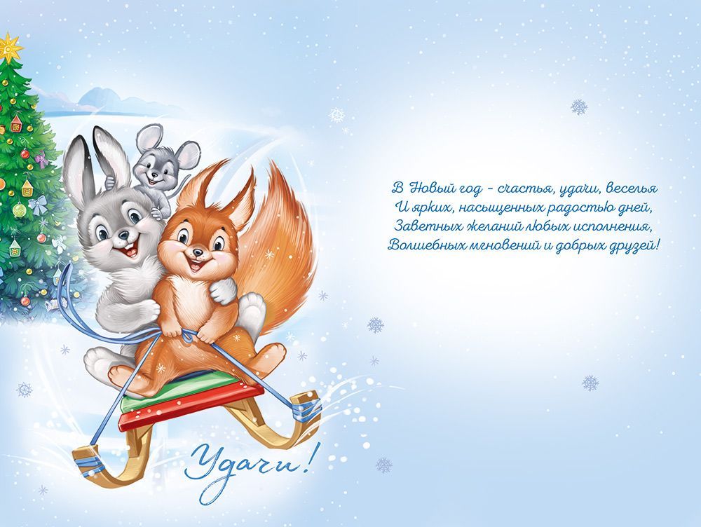 Открытка формата А5 с новогодним оформлением предназначена для массовых сезонных поставок и формирования ассортимента к зимним праздникам. Изделие выполнено из плотного картона, что обеспечивает достаточную жесткость, устойчивость к изгибам при транспортировке и хранении, а также аккуратный внешний вид при выкладке в рознице и вручении получателю. Лицевая сторона оформлена полноцветным изображением с зимним пейзажем, праздничной елкой и персонажами – зайцем, белкой и мышонком на санках, на фоне надписи «С Новым годом!» и пожелания «Удачи!». Внутри предусмотрен печатный поздравительный текст, что сокращает время подготовки к вручению при большом потоке клиентов и удобно для розничного покупателя, выбирающего готовое решение без необходимости самостоятельно составлять поздравление. Размер готового изделия 182 × 122 мм позволяет использовать открытку как самостоятельный сувенир либо как дополнение к подарку стандартных габаритов, она помещается в большинство типовых конвертов и пакетов. Поверхность без дополнительной отделки практична при складском хранении: открытки можно укладывать плотными стопами, минимизируя риск склеивания и повреждения, удобно формировать наборы и подарочные комплекты. Картонная основа подходит для нанесения ручных подписей, дат, персональных пожеланий обычной шариковой или гелевой ручкой без размазывания чернил. Открытка рассчитана на использование в детских и семейных сценариях поздравления, а также в сегменте корпоративных новогодних подарков, где требуется нейтральный, позитивный и понятный визуальный образ. Упаковка содержит 10 одинаковых экземпляров, что облегчает планирование закупок для магазинов, киосков, офисов продаж, учебных и детских учреждений, а также позволяет быстро закрывать потребность в однотипных поздравлениях для коллектива, классов или групп.