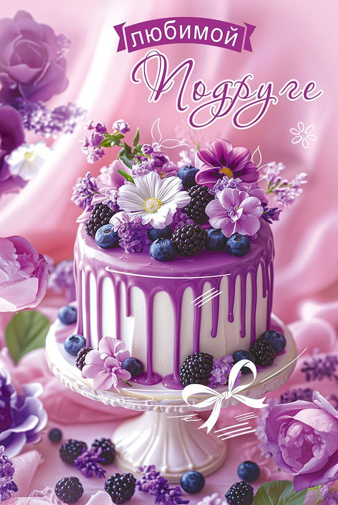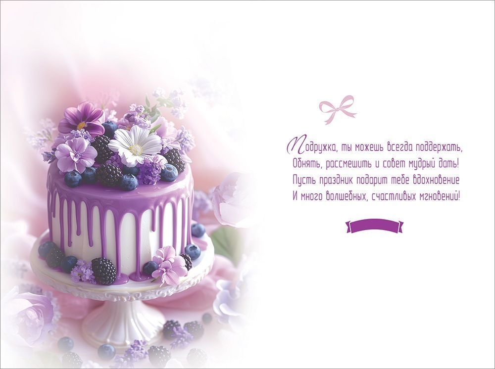 Открытка формата А5 изготовлена из плотного картона, обеспечивающего стабильную геометрию изделия и сохранность формы при хранении и транспортировке крупными партиями. Размер готового изделия 182 × 122 мм позволяет использовать открытку как самостоятельный подарок или дополнение к основному презенту, при этом формат удобен для стандартных почтовых конвертов и витринной выкладки. На лицевой стороне размещено полноцветное изображение праздничного торта с ягодами и цветами в фиолетово-розовой гамме и надписью «Любимой подруге», что определяет назначение открытки как решения для поздравления подруги с днём рождения, личным праздником или значимым событием. Печать выполнена с применением глянцевого УФ-лака, который подчёркивает отдельные элементы иллюстрации, повышает устойчивость изображения к истиранию и воздействию света, что важно при длительном хранении на складе и в торговом зале. Внутри предусмотрен готовый печатный текст поздравления, что сокращает время обслуживания конечного покупателя и делает позицию удобной для точек с высокой проходимостью и сетевой розницы. Картонная основа подходит для стандартных торговых стоек, не деформируется при вертикальной установке и позволяет формировать аккуратные стопки, оптимизируя использование полочного пространства. Открытка поставляется по 10 штук, что облегчает учёт, планирование запаса и формирование ассортимента в рамках одной тематики. Цветовое решение и нейтральная праздничная композиция делают изделие универсальным по возрасту получателя и совместимым с широким спектром подарочной упаковки и сувенирной продукции, что упрощает интеграцию данной позиции в существующие коллекции поздравительных товаров.