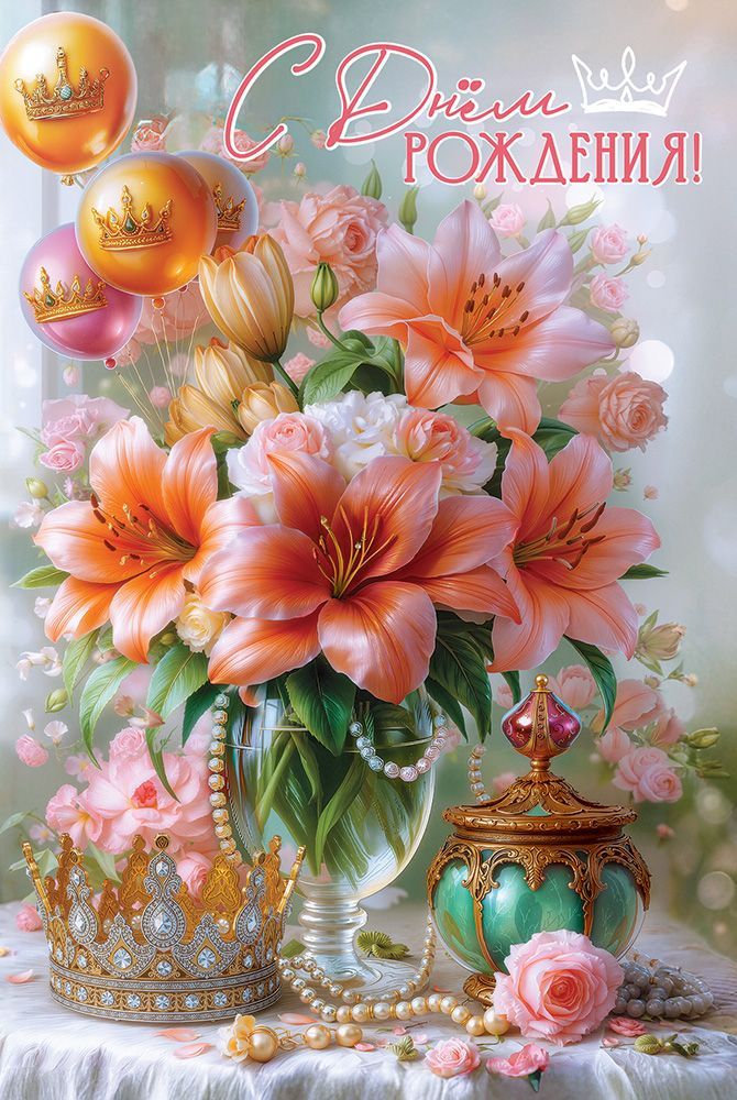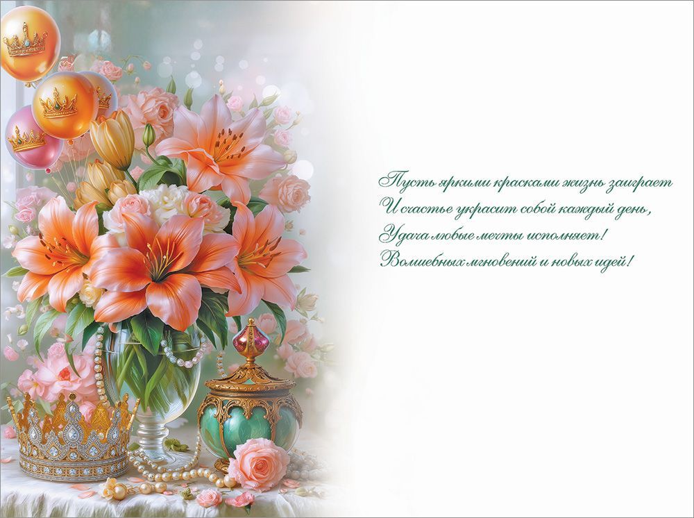 Открытка формата А5 предназначена для поздравления с днём рождения и ориентирована на использование в розничной продаже и оптовых поставках для магазинов подарков, канцелярии и сетевых торговых точек. Изделие выполнено из плотного картона, что обеспечивает стабильную геометрию, устойчивость к изгибам и удобство экспонирования на витрине или стеллаже. Лицевая сторона оформлена цветным изображением букета лилий и роз в вазе, дополненного декоративными элементами в виде корон, бус и воздушных шаров, с надписью «С Днём Рождения!». Покрытие УФ-лаком глянцевым придаёт поверхности износостойкость, защищает краску от истирания и выгорания, облегчает сухую чистку от пыли, а также подчёркивает детализацию иллюстрации, что важно при выкладке в зонах визуального контакта с покупателем. Внутри размещён поздравительный текст, позволяющий использовать открытку без дополнительного вклеивания листов или самостоятельного подбора формулировок; при необходимости остаётся место для личной подписи. Габариты готового изделия 182 × 122 мм обеспечивают совместимость с распространёнными форматами почтовых конвертов и пакетами для подарочной упаковки, что упрощает комплектацию заказов и логистику. В одной упаковке 10 открыток, что удобно для формирования структурированного ассортимента по тематикам и дизайнам, а также для планирования полочного запаса и учёта при оптовых закупках. Конструкция рассчитана на стандартные условия хранения в сухих закрытых помещениях, сохраняет форму при вертикальной и горизонтальной выкладке, подходит для продажи поштучно и комплектами в составе подарочных наборов.