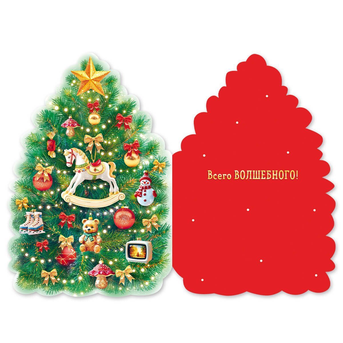 Открытка новогодняя формата А5 выполнена из плотного картона с фигурной вырубкой в виде ёлки, что придаёт изделию выраженный декоративный характер и выделяет его на полке среди стандартных прямоугольных открыток. Готовый размер составляет 182 × 122 мм, что удобно для выкладки в стандартных лотках, стеллажах и при почтовой пересылке. Лицевая сторона оформлена цветной печатью с детализированным новогодним рисунком: ёлка с игрушками, надпись «С Новым годом» и дополнительные праздничные элементы, что обеспечивает понятную сезонную принадлежность товара и упрощает планирование ассортимента к новогодним продажам. Отделка выполнена с использованием золотых блёсток в лаке, создающих мерцающий эффект при искусственном и дневном освещении; покрытие устойчиво к умеренному истиранию и не осыпается при аккуратной транспортировке и частом перелистывании, что важно при оптовых поставках и демонстрации образцов. Внутри открытки предусмотрен заранее нанесённый поздравительный текст, что сокращает время подготовки к вручению и делает изделие удобным для покупателей, предпочитающих готовое решение без необходимости придумывать формулировки. Конструкция дополнена художественным конвертом из плотной цветной бумаги, подобранной по тону к оформлению открытки; конверт защищает поверхность от загрязнений и механических повреждений, а также позволяет использовать открытку для почтовой отправки при соблюдении требований оператора связи по маркировке и тарифам. Материал основы — картон с достаточной жёсткостью, сохраняющий форму при вертикальной установке и хранении в стопках, что снижает риск деформаций при крупнооптовых поставках и длительном складском хранении. Открытка подходит для розничной продажи поштучно на кассовых зонах и в сезонных выкладках, а также для корпоративных закупок как базовый вариант новогоднего поздравления партнёров, клиентов и сотрудников. Универсальный сюжет оформления делает изделие актуальным для широкого круга получателей, в том числе семейных и детских адресатов, а компактный формат облегчает транспортировку и формирование смешанных партий. Количество в упаковке: 1.