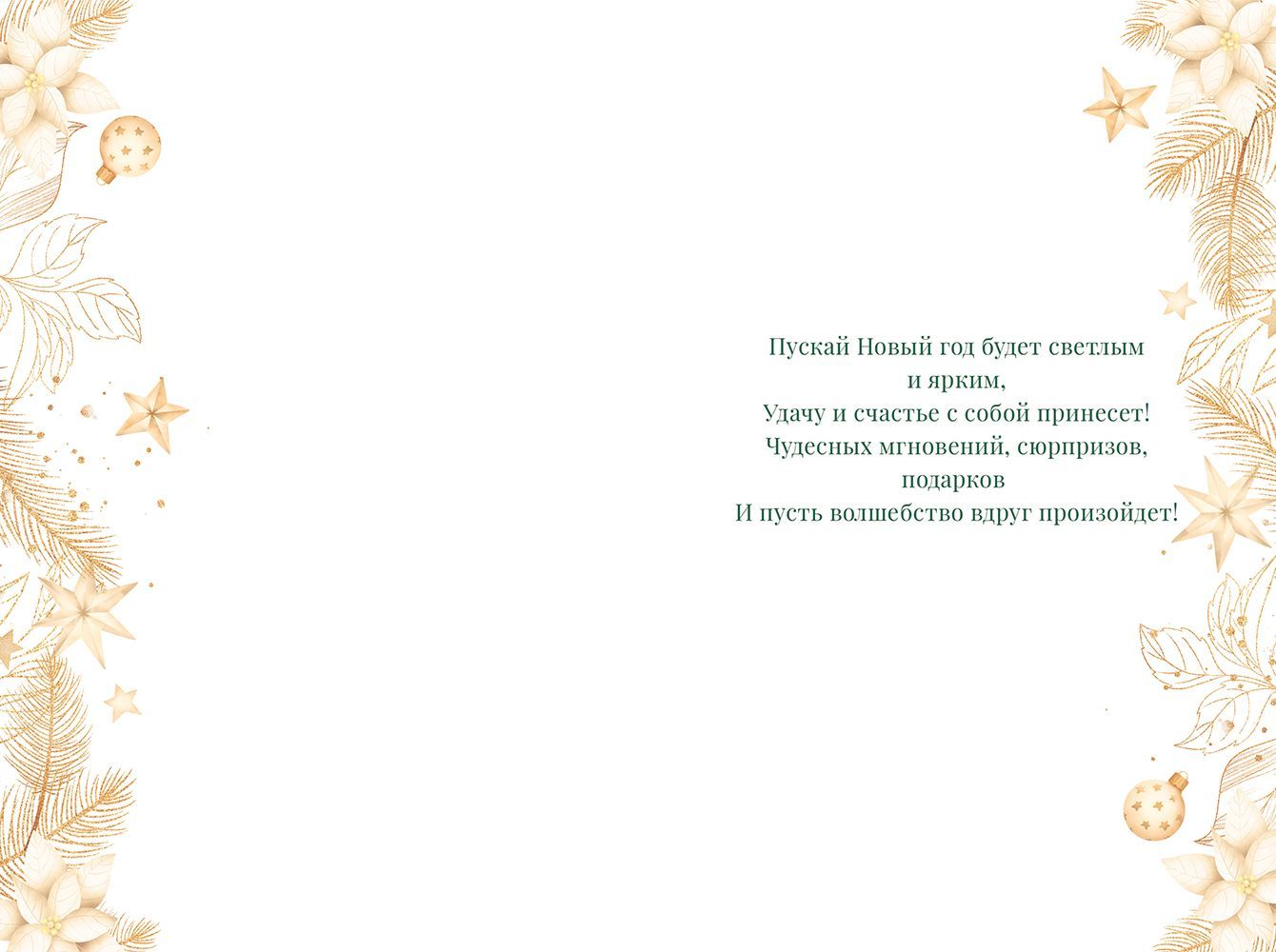 Открытка формата А5 предназначена для новогодних поздравлений в розничном и корпоративном сегменте и ориентирована на использование в массовых почтовых и ручных рассылках. Основа изделия выполнена из плотного картона, обеспечивающего стабильную геометрию при хранении, транспортировке и пересылке, а также устойчивость к изгибам и износу при многократном использовании в торговом обороте. Лицевая сторона оформлена полноцветным изображением новогодней композиции с еловыми ветвями и декоративными шарами в золотой гамме, дополненным надписью «С Новым годом!». Для визуального акцента применены блестки в лаке золотого цвета, создающие локальные сияющие участки и хорошо различимые при искусственном и дневном освещении, что делает открытку заметной на витрине и в выкладке у кассовых зон. Внутри размещен готовый поздравительный текст, что позволяет использовать изделие без дополнительной подготовки, оптимизируя время сотрудников при массовой подписи и снижая операционные затраты заказчика. Размер готового изделия 182 × 122 мм обеспечивает совместимость с распространенными почтовыми конвертами и стандартными упаковочными пакетами, упрощая формирование наборов и транспортных мест на складе. Плотный картонный материал хорошо держит печать, не просвечивает и сохраняет насыщенность красок при длительном хранении, что важно для сезонного ассортимента с остатками между праздничными периодами. Открытка может использоваться как самостоятельный поздравительный носитель, так и как вложение к подарочным наборам, сувенирной продукции и корпоративным подаркам, подходит для частных и деловых адресатов. В упаковке 10, что удобно для планирования закупок, формирования мелкооптовых партий и пополнения торговых точек в пиковый сезон спроса.