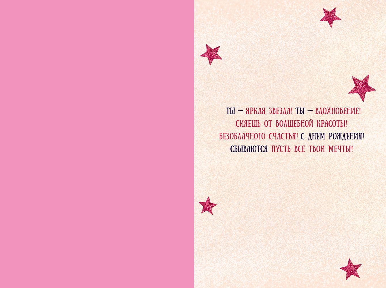 Открытка формата А6 с тематикой дня рождения предназначена для сегмента женских поздравлений и рассчитана на использование в розничной и оптовой продаже как самостоятельная единица ассортимента. Основой служит плотный картон, обеспечивающий устойчивость к сгибам и истиранию при транспортировке, выкладке и хранении в стандартных стеллажах и напольных стойках. Габаритные размеры готового изделия 182 × 122 мм позволяют размещать открытку в типовых конвертах соответствующего формата и использовать её в почтовых отправлениях без дополнительной подрезки. Лицевая сторона оформлена полноцветной печатью с изображением женского силуэта в короне и коктейлем, с надписями «Ты — королева!» и «В день твоего рождения», что задаёт чёткое назначение изделия — поздравление девушки или женщины с днём рождения. Поверхность декорирована блёстками в лаке золотого цвета, создающими устойчивый к осыпанию декоративный слой; такая отделка не требует специальных условий хранения, допускает многократный контакт с руками и не теряет внешний вид при кратковременном воздействии света и влаги в рамках обычной эксплуатации. Внутри открытки размещён готовый поздравительный текст, что снижает временные затраты конечного покупателя и делает изделие удобным решением для сетевой и несетевой розницы, киосков, магазинов подарков и сопутствующих товаров. Плотность картона оптимальна для вертикальной и горизонтальной выкладки, открытка не деформируется в стопках и коробах, что важно при оптовых поставках и длительном хранении на складе. В упаковке 10 изделий, что упрощает учёт, формирование заказов и планирование полочного пространства, а также позволяет использовать открытку как массовую позицию для сезонных и постоянных продаж в ассортименте поздравительной продукции.