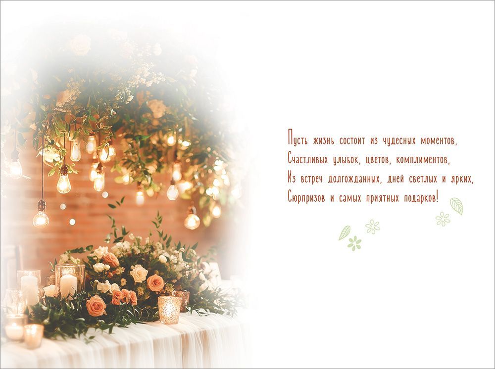 Открытка формата А5 предназначена для поздравления с днём рождения и ориентирована на использование в розничной продаже и оптовых поставках для торговых сетей, сувенирных и книжных магазинов. Изделие изготовлено из плотного картона, обеспечивающего стабильную форму, устойчивость к изгибам и истиранию при транспортировке, выкладке и хранении. Лицевая сторона оформлена полноцветным изображением празднично сервированного стола с цветочной композицией, свечами и декоративными гирляндами ламп, поверх которого размещена надпись «С Днём рождения!». Декор дополнен золотыми блёстками в лаке, создающими аккуратный визуальный акцент и умеренный блеск при искусственном и естественном освещении, что повышает привлекательность открытки на витрине и в подарочном наборе. Внутри предусмотрен печатный поздравительный текст, позволяющий использовать изделие в готовом виде без дополнительного оформления, при этом остаётся достаточно свободного места для личной подписи. Габариты готового изделия: длина 182 мм, ширина 122 мм, что соответствует стандартному формату и облегчает подбор конверта, размещение в стандартных дисплеях и коробах. Картонная основа хорошо переносит укладку в стопы, не деформируется при длительном хранении в складских условиях и обеспечивает удобство фасовки по 10 штук. Открытка может использоваться как самостоятельный элемент поздравления или как дополнение к подарку, подходит для оформления индивидуальных и корпоративных поздравлений, универсальна по тематике и уместна для широкого круга получателей разных возрастных групп. Дизайн выдержан в тёплой праздничной стилистике, что делает изделие актуальным для круглогодичного ассортимента и формирования стабильной полки в категории поздравительной продукции.
