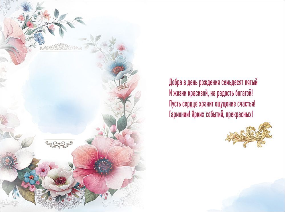 Открытка формата А5 предназначена для поздравления с 75‑летним юбилеем и ориентирована на использование в рознице и оптовых поставках для магазинов подарочной продукции, канцелярии и праздничного ассортимента. Изделие изготовлено из плотного картона, что обеспечивает стабильную геометрию, устойчивость к изгибам и истиранию при транспортировке и выкладке. Лицевая сторона оформлена крупной надписью «75» и текстом «С юбилеем!» на светлом фоне с детализированным цветочным орнаментом и декоративными элементами, сочетающимися с различными вариантами подарочной упаковки. Дополнительный визуальный эффект создают золотые блестки в лаке, подчеркивающие цифру юбилея и отдельные элементы рисунка; покрытие закреплено равномерно, не осыпается при стандартной эксплуатации и не требует специальных условий хранения, достаточно защиты от влаги и прямых солнечных лучей. Внутри открытки размещен готовый поздравительный текст, что сокращает время обслуживания покупателей и упрощает выбор конечному пользователю, при необходимости оставляя место для личной подписи. Размер готового изделия составляет 182 мм в длину и 122 мм в ширину, параметры выдержаны с допуском, удобны для стандартных почтовых конвертов соответствующего формата и для размещения на полке или в напольных и настольных стойках. Плотность картона и стандартный формат позволяют компактно упаковывать и транспортировать товар крупными партиями, оптимизируя складское хранение и снижая риск деформации. В упаковке 10 открыток, что удобно для планирования ассортимента по группам юбилейных дат и поддержания стабильного наличия позиции в торговой точке. Открытка подходит для поздравления как женщин, так и мужчин, может использоваться в семейных, корпоративных и официальных сценариях, формируя законченный вид подарка без необходимости подбора сложных дополнительных аксессуаров.