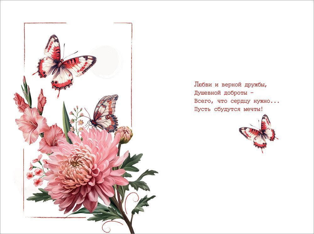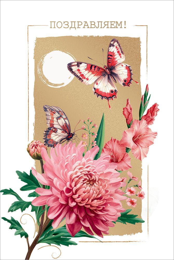 Открытка формата А5 предназначена для универсального поздравления и может использоваться в розничной продаже, корпоративных рассылках и как элемент сопутствующего ассортимента к подарочной продукции. Изделие выполнено из плотного картона, что обеспечивает стабильную геометрию при транспортировке и хранении, устойчивость к изгибам и сохранение внешнего вида при длительном экспонировании на витрине. Готовый размер открытки 182 × 122 мм, что удобно для стандартных конвертов и позволяет размещать внутри разборчивый текст поздравления от руки либо использовать изделие как вложение к подарку без конверта. Лицевая сторона оформлена полноцветным изображением крупного цветка, декоративных бутонов и бабочек на фоне прямоугольной золотистой плашки с надписью «Поздравляем!». В отделке применены золотые блестки в лаке, создающие локальные акценты и придающие изображению выраженный декоративный эффект при искусственном и дневном освещении; покрытие устойчиво к осыпанию при стандартной эксплуатации и не требует дополнительной защиты. Внутри расположен печатный поздравительный текст, что сокращает время подготовки к вручению и удобно при массовых поздравлениях сотрудников, клиентов или партнеров. Конструкция открытки представляет собой классический разворот на сгибе, обеспечивающий аккуратное открывание и достаточную площадь для дополнительной подписи. Материал и формат подобраны таким образом, чтобы изделие было совместимо с типовыми почтовыми и подарочными конвертами, а также удобно укладывалось в коробочные и стеллажные системы хранения на складе. В упаковке 10 одинаковых открыток, что оптимизирует учет и планирование закупок для оптовых клиентов, позволяет формировать однородные партии для сетей розничной торговли, цветочных салонов и служб доставки подарков, а конечному покупателю обеспечивает единый визуальный стиль при поздравлении группы адресатов.