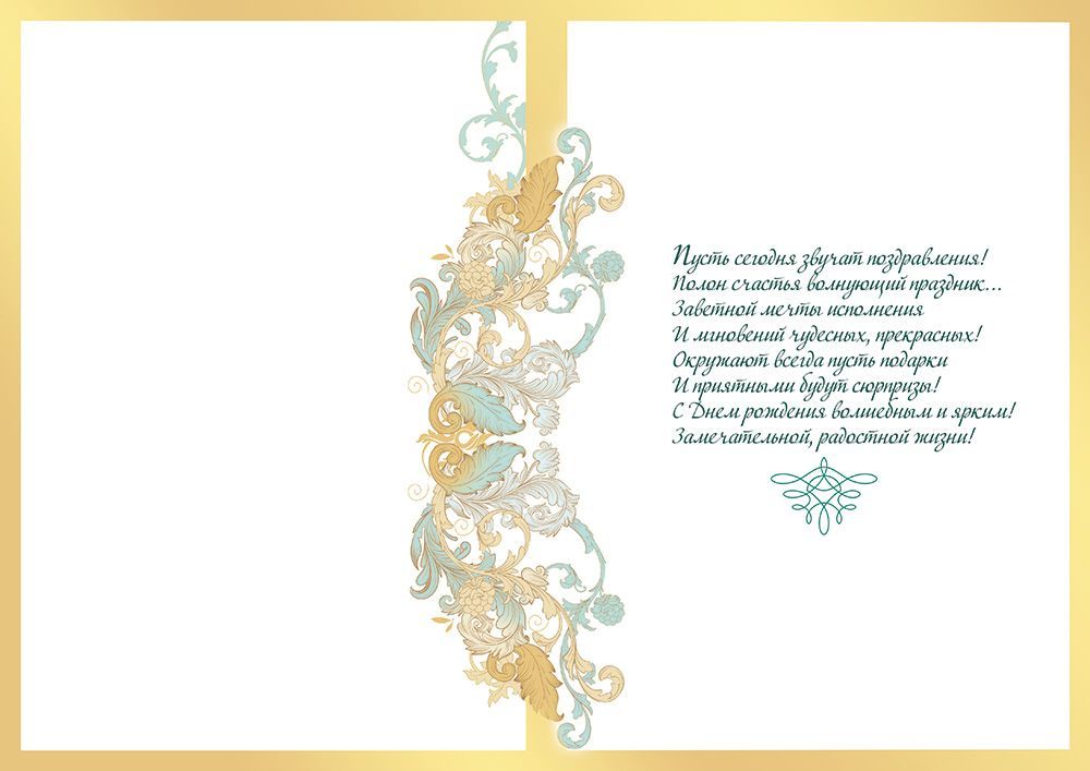 Открытка формата А4 предназначена для оформления индивидуальных поздравлений с днём рождения и удобна как для розничной покупки, так и для оптовых поставок в магазины, канцелярские отделы и сувенирные точки. Изделие изготовлено из плотного картона, что обеспечивает устойчивость к изгибам, сохранение геометрии и аккуратный внешний вид при транспортировке и длительном хранении на витрине или складе. Готовый размер открытки составляет 277 × 196 мм, что даёт достаточно пространства для внутреннего текстового блока и при необходимости дополнительной рукописной подписи. На лицевой стороне размещена композиция с подарочными коробками и розами в бирюзово‑золотистой гамме, а также поздравительная надпись «В прекрасный день рождения», что позволяет использовать изделие как универсальное решение для поздравления взрослых адресатов. Декор выполнен с применением золотых блёсток в лаке, за счёт чего отдельные элементы орнамента и надписи имеют выразительный блестящий эффект, оставаясь при этом устойчивыми к осыпанию при стандартной эксплуатации, раскладке по полкам и пересылке. Внутри открытки нанесён готовый поздравительный текст, что сокращает время обслуживания клиентов в рознице и упрощает выбор при массовых закупках к сезонным пиковым датам. Плотный картон совместим с большинством стандартных конвертов соответствующего формата, не деформируется при пересылке почтой и в курьерских службах. Открытка поставляется по 10 штук, что удобно для формирования упорядоченного ассортимента, планирования остатков и выкладки серийными блоками. Универсальный дизайн позволяет включать данную позицию в базовый ассортимент поздравительных товаров, поддерживая стабильный спрос в течение всего года и обеспечивая предсказуемое использование как единичными покупателями, так и корпоративными клиентами при поздравлении сотрудников и партнёров.