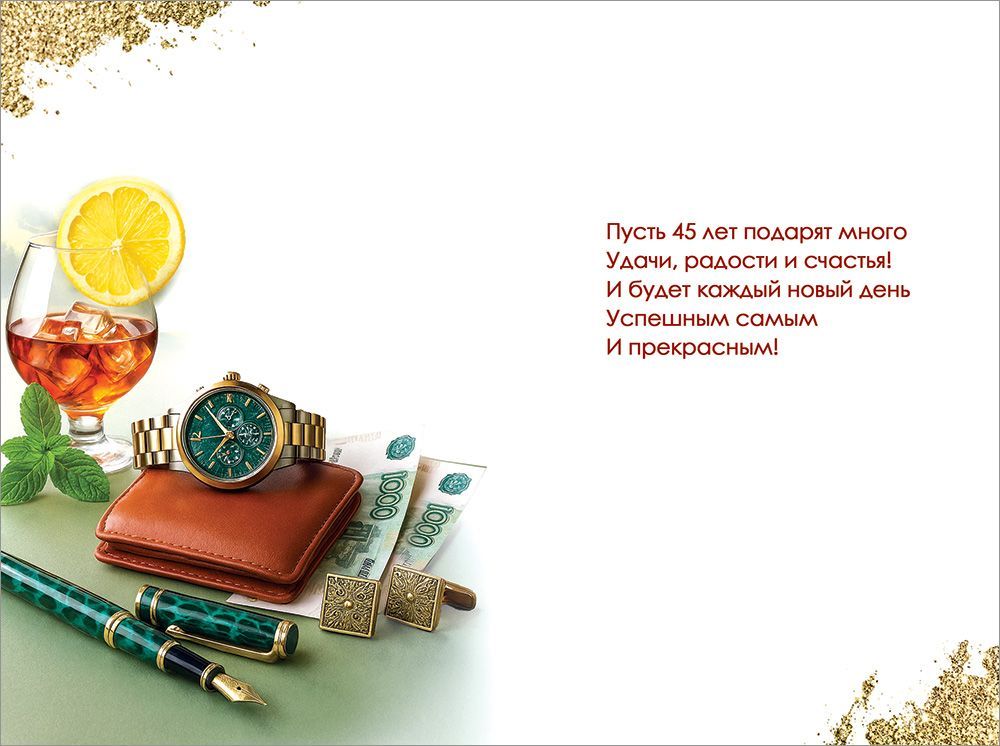 Открытка формата А5 «С юбилеем! 45» предназначена для поздравления с сорокапятилетним юбилеем и ориентирована на деловое и личное дарение. Изделие выполнено из плотного картона, что обеспечивает устойчивость к изгибам, сохранность формы и удобство при транспортировке и складском хранении в стандартных коробах. Лицевая сторона оформлена полноцветной печатью с изображением композиции в деловой мужской тематике: часы на металлическом браслете, кожаный бумажник, банкноты, письменные принадлежности, бокал с напитком и цитрусовым ломтиком, что делает открытку уместной для вручения руководителям, коллегам, партнёрам и знакомым. Заголовок «С Юбилеем!» и крупное число «45» выделены на фоне пейзажа и дополнены декоративным оформлением. Отделка включает блестки в лаке золотого цвета, создающие акцент на надписях и отдельных элементах изображения, при этом покрытие устойчиво к осыпанию при аккуратной эксплуатации и не увеличивает толщину изделия до критичных значений, что важно при машинной или ручной конвертовке и упаковке тиражей. Внутри предусмотрен готовый поздравительный текст, позволяющий использовать открытку без дополнительной доработки, что сокращает время обслуживания клиентов в розничных точках и упрощает подготовку к массовым поздравлениям в организациях. Габаритные размеры готового изделия составляют 182 × 122 мм, что соответствует распространённым почтовым и подарочным конвертам и облегчает подбор сопутствующей упаковки. Плотный картон и стандартный формат обеспечивают стабильное штабелирование при хранении на складе и в торговом зале, а также удобство учёта и инвентаризации. В упаковке 10, что позволяет формировать оптимальные для оптовых закупок партии, поддерживать равномерную выкладку по юбилейной линейке и планировать ассортимент поздравительной продукции по возрастным категориям.
