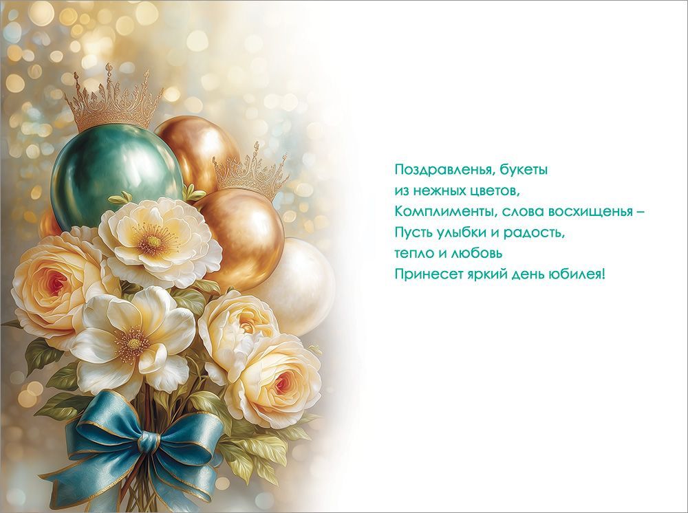 Открытка формата А5 предназначена для оформления поздравлений с юбилеем и ориентирована на использование в стабильном ассортименте розничных и оптовых закупок. Изделие выполнено из плотного картона, что обеспечивает достаточную жесткость, устойчивость к изгибам и сохранение геометрии при транспортировке и хранении в стандартных коробах и стеллажных системах. Готовый размер 182 × 122 мм удобен для выкладки на полочных держателях и в кассовой зоне, совместим с типовыми почтовыми конвертами соответствующего формата. Лицевая сторона содержит полноцветное изображение букета роз и декоративных цветов на фоне праздничных шаров с коронами и надписью «С Юбилеем!», что делает открытку универсальной для поздравления с разными вариантами юбилейных дат, как личных, так и профессиональных. Декорирование выполнено с использованием золотых блесток в лаке, создающих выраженный акцент на отдельных элементах композиции и устойчивый к истиранию при аккуратной эксплуатации; покрытие не осыпается при стандартных условиях перевозки и многократном перекладывании товара. Внутри расположен заранее нанесенный поздравительный текст, позволяющий сократить время обслуживания конечного покупателя и упростить выбор готового решения для поздравления, при этом остается свободное место для личной подписи и даты. Открытка поставляется по 10 штук, что удобно для формирования витринных выкладок, планирования остатков и учета при оптовых поставках. Нейтральная цветовая гамма с сочетанием теплых кремово-золотистых тонов и бирюзовых акцентов подходит для дарения получателям разных возрастных групп и статусов, а стандартный формат и прочный картон обеспечивают совместимость с распространенными конвертами и подарочными пакетами, что важно как для конечного пользователя, так и для розничного продавца при формировании комплексных предложений.