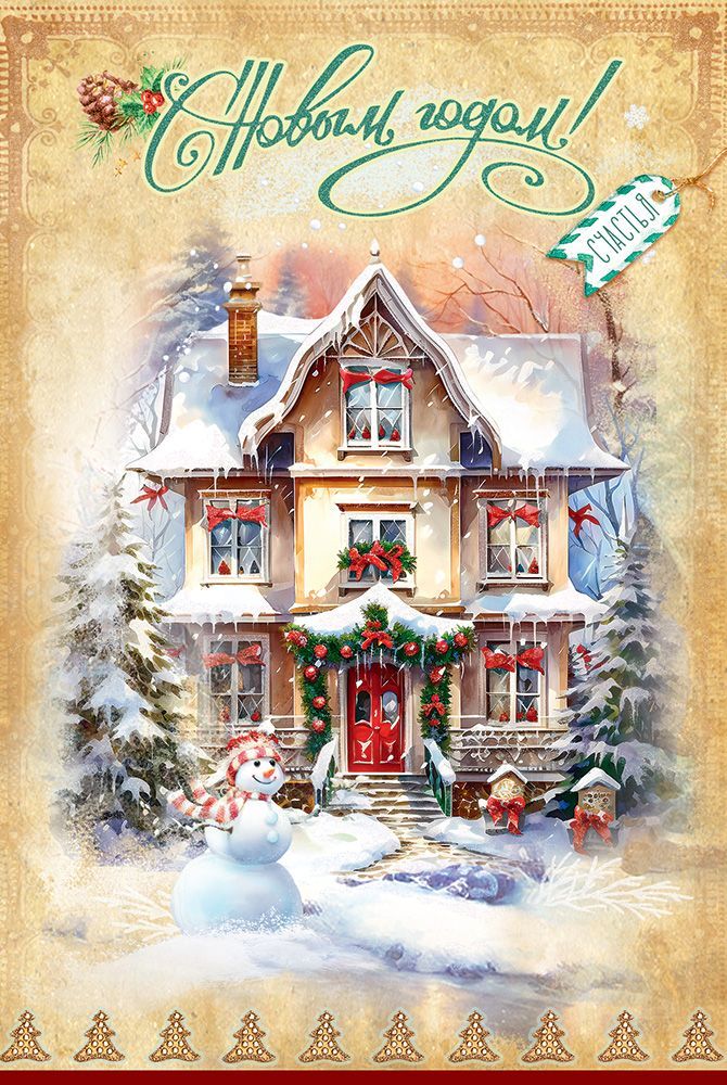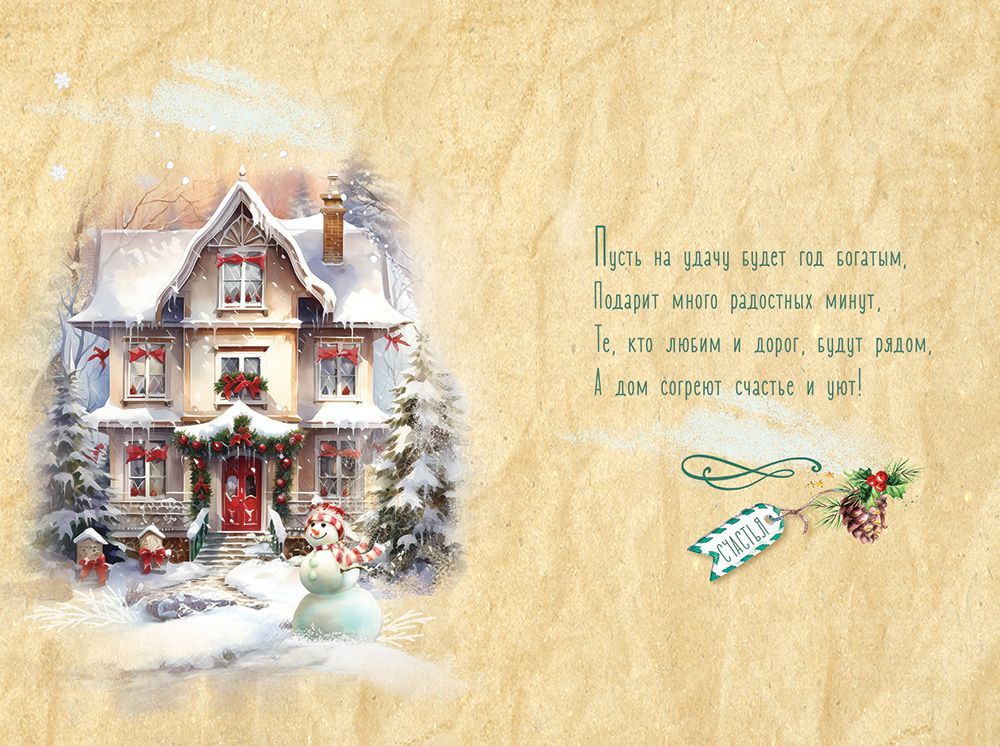 Открытка формата А5 предназначена для оформления новогодних поздравлений в розничном и корпоративном сегменте и удобна для включения в ассортимент сезонной продукции. Изделие выполнено из плотного картона, что обеспечивает достаточную жесткость, устойчивость к изгибам при транспортировке и хранении, а также аккуратный внешний вид при передаче получателю. Готовый размер 182 × 122 мм позволяет использовать открытку как самостоятельный поздравительный носитель или в комплекте с подарком стандартных габаритов. Лицевая сторона оформлена полноцветным изображением зимнего дома с декоративной подсветкой, снеговиком и новогодним декором, дополненным надписью «С Новым годом!» и тегом «Счастья», что делает изделие универсальным решением для поздравления адресатов разного возраста и статуса, в том числе деловых партнеров и сотрудников. Поверхность частично покрыта блестками в лаке радужными, за счет чего создается дополнительный оптический эффект при искусственном и дневном освещении; при этом декоративный слой устойчив к осыпанию при стандартном обращении, что важно при оптовых поставках и длительной логистике. Внутри предусмотрен заранее напечатанный поздравительный текст, позволяющий сократить время на подготовку массовых рассылок и поздравительных наборов, при необходимости оставляя место для краткой личной подписи. Картонная основа совместима с распространенными типами шариковых и гелевых ручек, не дает сильного просвечивания чернил и сохраняет читаемость надписей. Открытки упакованы по 10 штук, что удобно для планирования закупок, формирования витрин и распределения по торговым точкам, а также для комплектования подарочных наборов в офисах и розничных хозяйствах. Компактный формат и стандартная прямоугольная форма способствуют рациональному размещению в коробах и на стеллажах, снижая риск деформации и облегчая учет сезонных остатков.