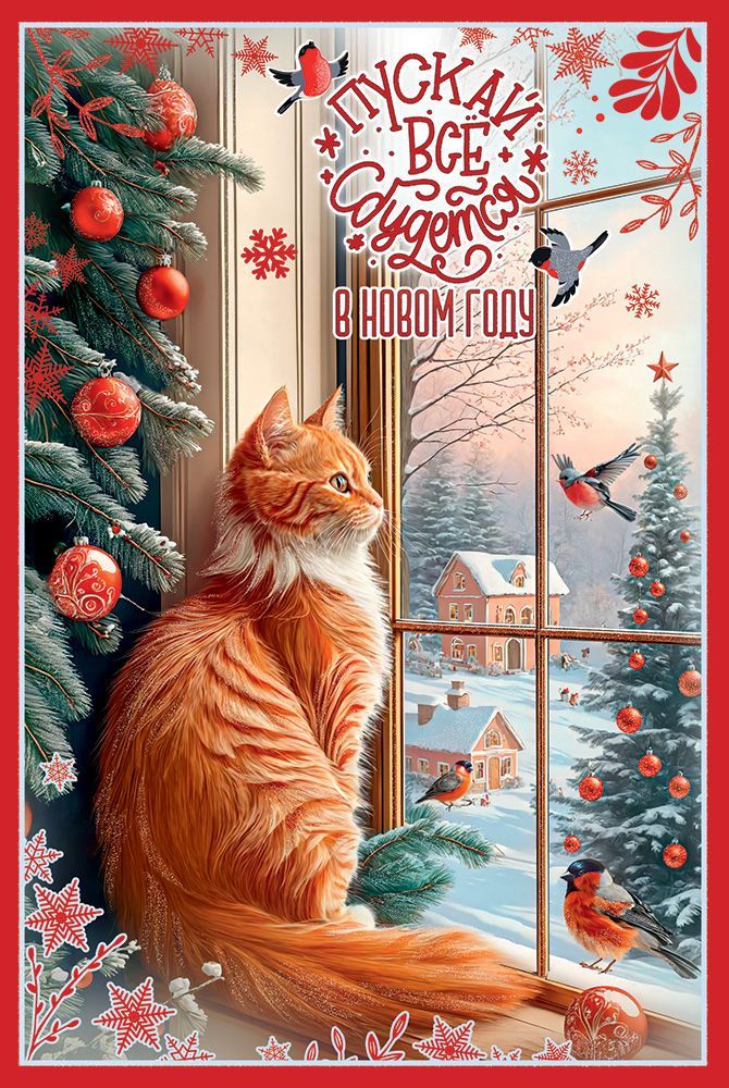 Открытка «Пускай все сбудется в Новом году» в формате А5 станет прекрасным дополнением к подарку и украсит любое поздравление. Новогодний сюжет, изображенный на изделии, никого не оставит равнодушным. На окне сидит рыжий пушистый котик и смотрит на улицу. Перед и за окном можно увидеть нарядные елки с яркими красными шариками. Внутри открытки – замечательные стихи с теплыми пожеланиями. Такой презент можно вручить в дополнение к основному подарку, чтобы украсить поздравление и сделать его более оригинальным. Изделие выполнено из качественных материалов, что обеспечивает ему прочность и долговечность, поэтому оно станет чудесным памятным сувениром для получателя.
