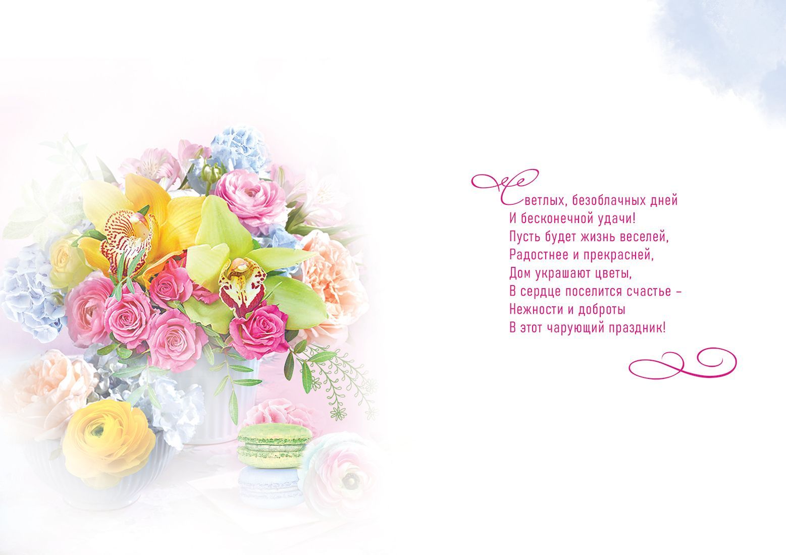 Открытка формата А4 предназначена для оформления поздравлений с днём рождения и ориентирована на использование в розничной продаже и оптовых поставках для торговых сетей, канцелярских отделов и сувенирной продукции. Изделие изготовлено из плотного картона, что обеспечивает стабильную геометрию, устойчивость к изгибам и сохранение формы при транспортировке и хранении в стандартных лотках и коробах. Габаритные размеры готовой открытки составляют 277 × 196 мм, что удобно для размещения в витринных экспозициях и на полках с вертикальной выкладкой. Лицевая сторона оформлена полноцветным изображением букета из роз, орхидей и других декоративных цветов на мягком розово-голубом фоне с дополнительными элементами в виде кондитерских изделий, а также содержит поздравительную надпись «С Днём рождения!» и композицию с пожеланиями «улыбок, тепла, добра». Печатное изображение дополнено отделкой блестками в лаке радужными, за счёт чего отдельные элементы рисунка приобретают избирательный глянец и лёгкий перелив при освещении, оставаясь при этом устойчивыми к истиранию при аккуратной эксплуатации. Внутри открытки размещён готовый поздравительный текст, что сокращает время подготовки к вручению и делает изделие удобным для покупателей, которым требуется быстрое решение без самостоятельного составления поздравления; при этом остаётся свободное поле для личной подписи и индивидуальных пожеланий. Материал и формат позволяют использовать открытку как самостоятельный подарок-сопровождение к основному презенту, а также как элемент декоративного оформления праздничного стола или зоны поздравлений. В упаковке 10 экземпляров, что упрощает планирование закупок, формирование ассортимента по группам праздников и обеспечивает удобный учёт остатков на складе и в торговом зале. Открытка совместима с большинством стандартных конвертов и пакетов для подарочной упаковки соответствующего формата, не требует специальных условий хранения, допускает длительное складирование в сухих помещениях без потери потребительских свойств.