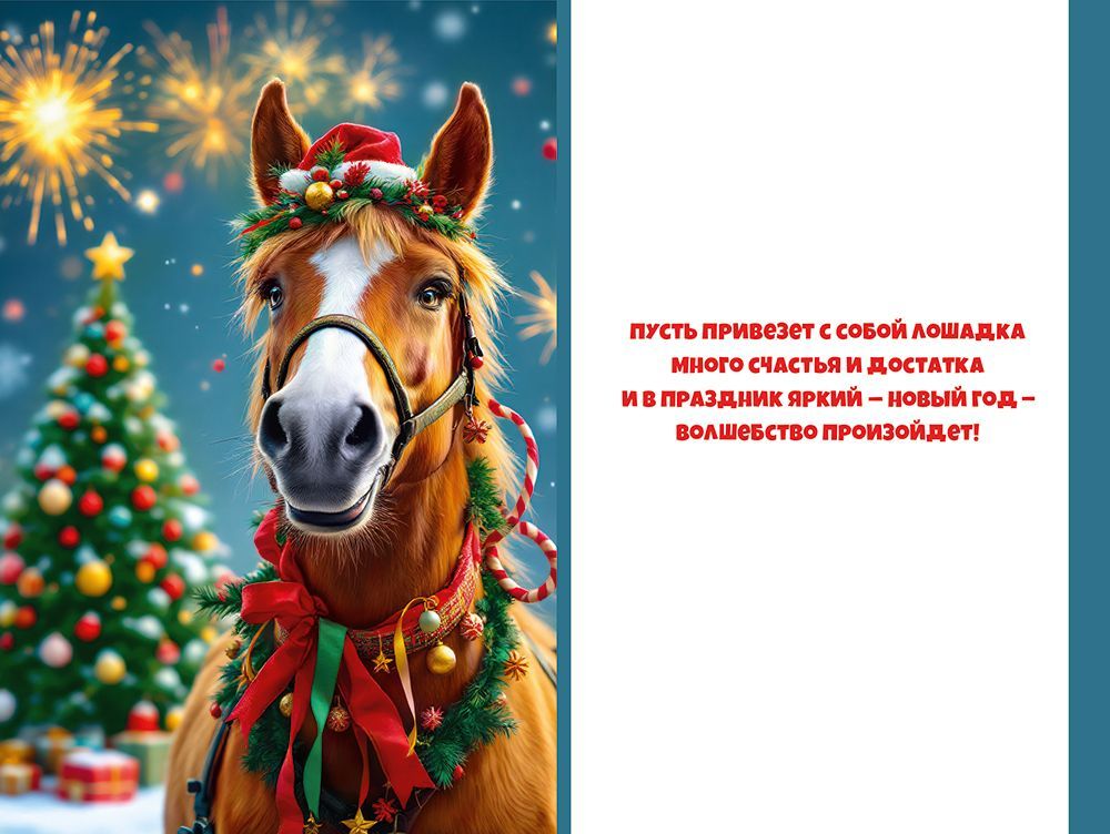 Открытка формата А5 изготовлена из плотного картона, что обеспечивает жесткость, устойчивость к деформации при хранении и транспортировке и позволяет использовать изделие в массовых новогодних рассылках и розничной выкладке. Лицевая сторона оформлена полноцветным изображением новогодней лошади на фоне елки и праздничного фейерверка, в композицию включена крупная надпись «С Новым и-го-го-дом!», хорошо читаемая с расстояния и заметная на витрине. Печать выполнена с применением глянцевого УФ-лака, который придает поверхности дополнительную износостойкость, защищает краску от истирания и выцветания, облегчает протирание от загрязнений и подчеркивает яркость цветов при искусственном и дневном освещении. Внутри размещен готовый поздравительный текст, что сокращает время подготовки к отправке и делает изделие удобным для корпоративных поздравлений, вложения в подарочные наборы, конверты и почтовые отправления. Длина готового изделия составляет 182 мм, ширина — 122 мм, размеры подобраны с учетом стандартных почтовых и подарочных конвертов, что упрощает подбор сопутствующей упаковки и планирование логистики для оптовых закупок. Картонная основа хорошо держит сгиб, не растрескивается по линии сгиба и подходит для длительного хранения на складе без потери внешнего вида при соблюдении обычных условий влажности и температуры. Открытка может использоваться как самостоятельный элемент подарка, как вложение к сувенирной продукции или дополнение к корпоративным подарочным наборам; за счет универсального новогоднего сюжета подходит для поздравления партнеров, клиентов, сотрудников, а также для частного дарения в семейном и дружеском кругу. Упаковка содержит 10 одинаковых открыток, что удобно для планирования тиражей, формирования витринных выкладок и оптимизации закупок для розничных и корпоративных заказов.
