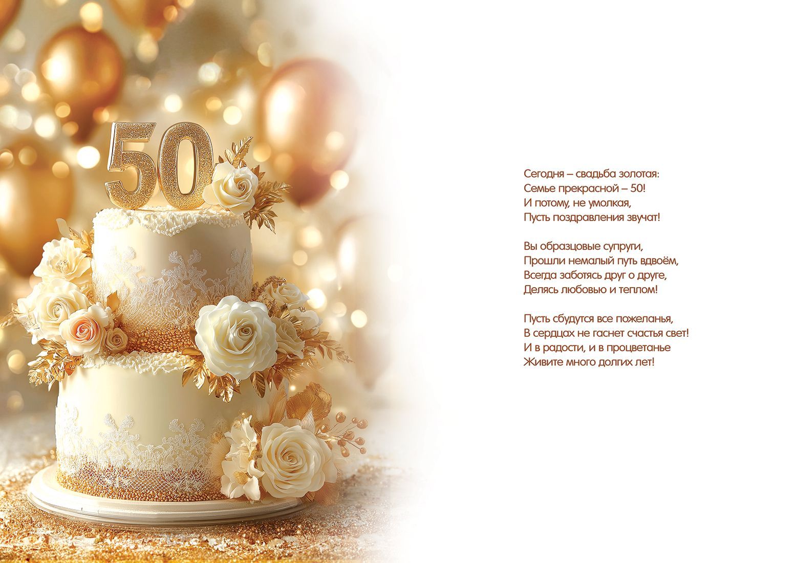 Открытка формата А4 предназначена для поздравления с 50‑летним юбилеем свадьбы и ориентирована на использование в качестве самостоятельного подарочного носителя текста поздравления. Изделие изготовлено из плотного картона, что обеспечивает достаточную жесткость, устойчивость к изгибам и сохранение формы при транспортировке и хранении в стандартных коробах и стеллажных системах. Лицевая сторона оформлена полноцветным изображением двухъярусного праздничного торта в золотисто‑кремовой гамме с крупной цифрой «50» и надписью «С юбилеем свадьбы!», фоном служит расфокусированная композиция из шаров и бликов, создающая выразительный, но не перегруженный визуальный акцент. Декор дополнен золотыми блестками в лаке, за счет чего поверхностный слой имеет локальные глянцевые участки с мерцающим эффектом, устойчивым к истиранию при обычной эксплуатации. Внутри размещен готовый поздравительный текст, позволяющий использовать открытку без дополнительной доработки, что удобно для розничного покупателя и снижает временные затраты при массовой подготовке поздравлений в организациях. Размер готового изделия 277 × 196 мм обеспечивает хорошую читаемость текста и заметность открытки среди сопутствующей полиграфии, при этом формат остается совместимым с распространенными пакетами, конвертами и витринными держателями. Материал и технология печати рассчитаны на длительное сохранение цветопередачи без выгорания при кратковременном воздействии света и нормальной влажности, что важно при складском хранении крупных партий и выкладке в торговом зале. Плотный картон облегчает укладку стопами, снижает риск заломов углов и деформации при пересылке, а также позволяет использовать открытку как элемент декоративного оформления праздничного стола или подарочного набора. В упаковке предусмотрено 10 изделий, что удобно для оптового заказа, формирования серийных поздравительных комплектов и планирования ассортимента по тематике «золотая свадьба» в розничных и корпоративных закупках.