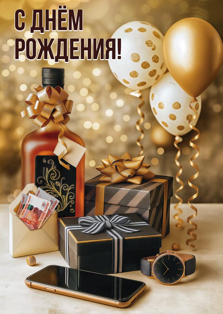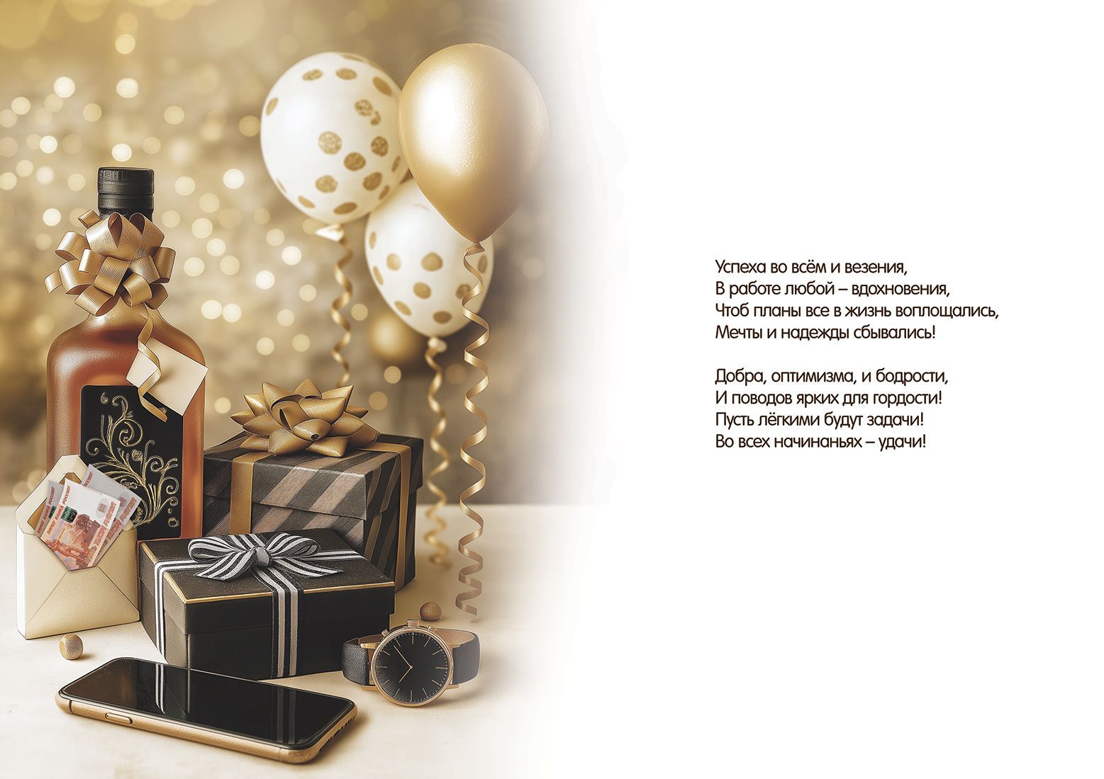 Открытка формата А4 предназначена для оформления поздравлений с днём рождения и ориентирована на использование в розничной продаже и оптовых поставках для магазинов подарков, книжных сетей и корпоративных закупок. Основа изделия выполнена из плотного картона, обеспечивающего стабильную геометрию, устойчивость к изгибам и сохранение внешнего вида при транспортировке и длительном хранении в складских условиях. Готовое изделие имеет длину 277 мм и ширину 196 мм, что позволяет использовать открытку как самостоятельный подарок или как дополнение к основному презенту стандартных размеров. На лицевой стороне размещена композиция в золотисто-коричневой гамме: подарочные коробки, бутылка в праздничном оформлении, конверт с вложением, часы, смартфон и воздушные шары, что визуально подчёркивает тематику праздника для взрослого адресата и хорошо сочетается с популярными вариантами подарков. Текст «С ДНЁМ РОЖДЕНИЯ!» выполнен крупным шрифтом, легко читается с расстояния и подходит для витринной выкладки. Изображение дополнено отделкой блестки в лаке золотые, создающей умеренный декоративный эффект при искусственном и дневном освещении, без избыточного осыпания при эксплуатации. Внутри открытки размещён поздравительный текст, что сокращает время подготовки к вручению и удобно при массовых поздравлениях сотрудников, клиентов или партнёров. Плотность картона и формат изделия позволяют размещать открытку в стандартных конвертах соответствующего размера или вкладывать её в подарочные пакеты; поверхность пригодна для нанесения подписи от руки, печати штампом или короткого корпоративного обращения. Упаковка содержит 10 одинаковых открыток, что упрощает планирование запасов, формирование однородных партий и оптимизацию полочного пространства. Изделие подходит для сезонного и постоянного ассортимента, так как тематика дня рождения востребована круглый год и не привязана к конкретному году или событию.