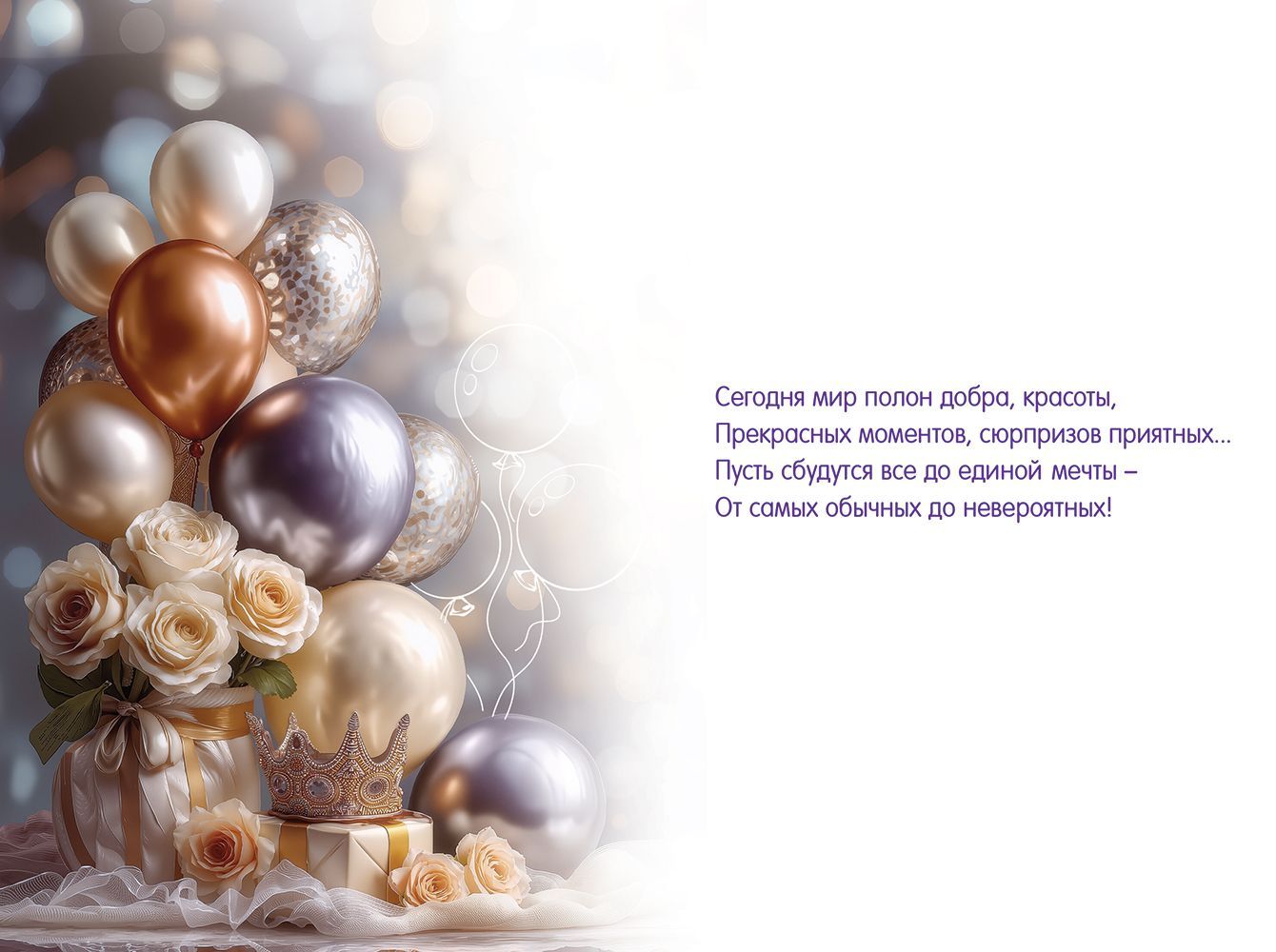 Открытка формата А5 предназначена для оформления поздравлений с днём рождения и подходит для использования в розничной продаже и оптовых поставках. Изделие изготовлено из плотного картона, обеспечивающего устойчивость к изгибам и истиранию при транспортировке, выкладке в торговом зале и последующей эксплуатации. Размер готового изделия 182 × 122 мм позволяет размещать открытку в стандартных конвертах и на типовых витринах, а также формировать ровные стопы при складском хранении. Лицевая сторона оформлена полноцветным изображением композиции из воздушных шаров, роз и подарочной коробки с короной в золотисто-перламутровой гамме; надпись «С Днём рождения!» и декоративный фон визуально выделены за счёт радужных блесток в лаке, создающих умеренный перелив при искусственном и дневном освещении и не осыпающихся при длительном контакте. Внутри предусмотрен готовый поздравительный текст, что сокращает время обслуживания покупателей и упрощает выбор конечному пользователю: открытка сразу готова к вручению, при необходимости остаётся место для личной подписи. Поверхность картона пригодна для письма шариковыми и гелевыми ручками без размазывания чернил. Конструкция листа сохраняет геометрию при частом перелистывании, что важно при демонстрации образцов в каталоге или на стойке. Нейтральный, но торжественный дизайн с цветами и шарами подходит для широкого круга адресатов — взрослых и подростков, коллег, партнёров и родственников, что делает модель универсальной позицией в ассортименте праздничной продукции и удобной для планирования закупок на сезонные и постоянные продажи. В упаковке 10.