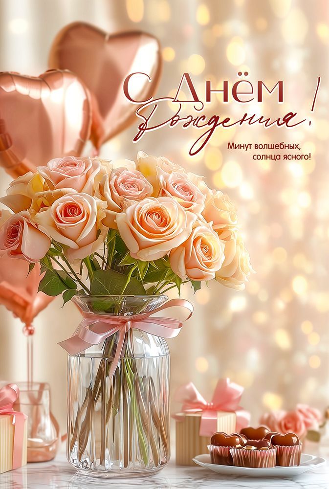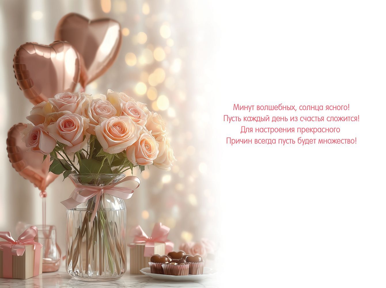 Открытка формата А5 предназначена для оформления поздравлений с днём рождения и ориентирована на использование в розничной продаже и оптовых поставках для торговых сетей, сувенирных отделов и корпоративных заказчиков. Основа изделия выполнена из плотного картона, обеспечивающего стабильную геометрию и устойчивость к изгибам при транспортировке и хранении. Готовое изделие имеет размеры 182 × 122 мм, что соответствует стандартному формату и упрощает подбор конвертов и размещение на торговых стеллажах. На лицевой стороне размещено изображение букета роз в стеклянной вазе на праздничном фоне с воздушными шарами и подарочными коробками, дополненное поздравительной надписью «С Днём рождения!» и текстовым пожеланием. В оформлении использованы радужные блестки в лаке, создающие аккуратный декоративный акцент и придающие изображению дополнительный визуальный объем без утолщения поверхности; покрытие стойко к истиранию и не осыпается при стандартной эксплуатации. Внутри открытки предусмотрен готовый поздравительный текст, что удобно для розничных покупателей и экономит время при массовых корпоративных поздравлениях. Плотный картон позволяет использовать открытку как самостоятельный элемент подарка или как дополнение к букету и сувениру, она сохраняет форму при установке на столе или витрине. Нейтральная цветовая гамма с преобладанием мягких розово-золотистых тонов делает изделие универсальным по адресату и подходящим для поздравления коллег, партнёров, клиентов и близких людей. Упаковка содержит 10 открыток, что удобно для формирования запасов на складе, планирования объёма закупок и оптимизации выкладки: стандартный формат облегчает учет, штабелирование и транспортировку в коробах без риска деформации.